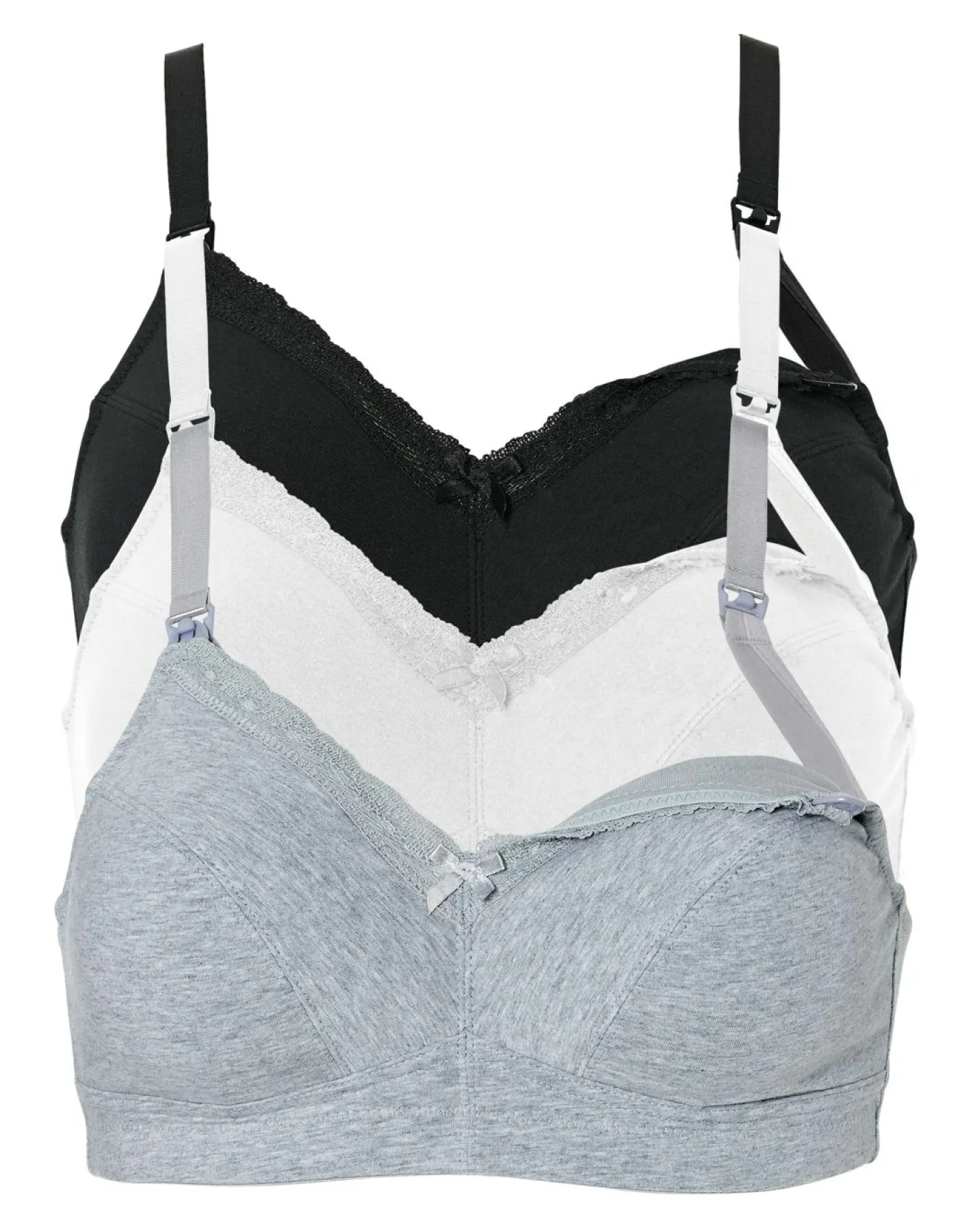 Cómodo sujetador de lactancia con atractivo ribete de encaje. Aquí encontrarás tres bonitos sujetadores de lactancia sin aros. Cómodos de llevar gracias a la suavidad del algodón. La copa forrada de algodón garantiza un ajuste cómodo. Una estrecha banda de encaje en la parte superior de la copa adorna este sujetador de lactancia. Con cierres de clip para facilitar la apertura de las copas con una sola mano. 1 blanco, 1 negro y 1 gris jaspeado.