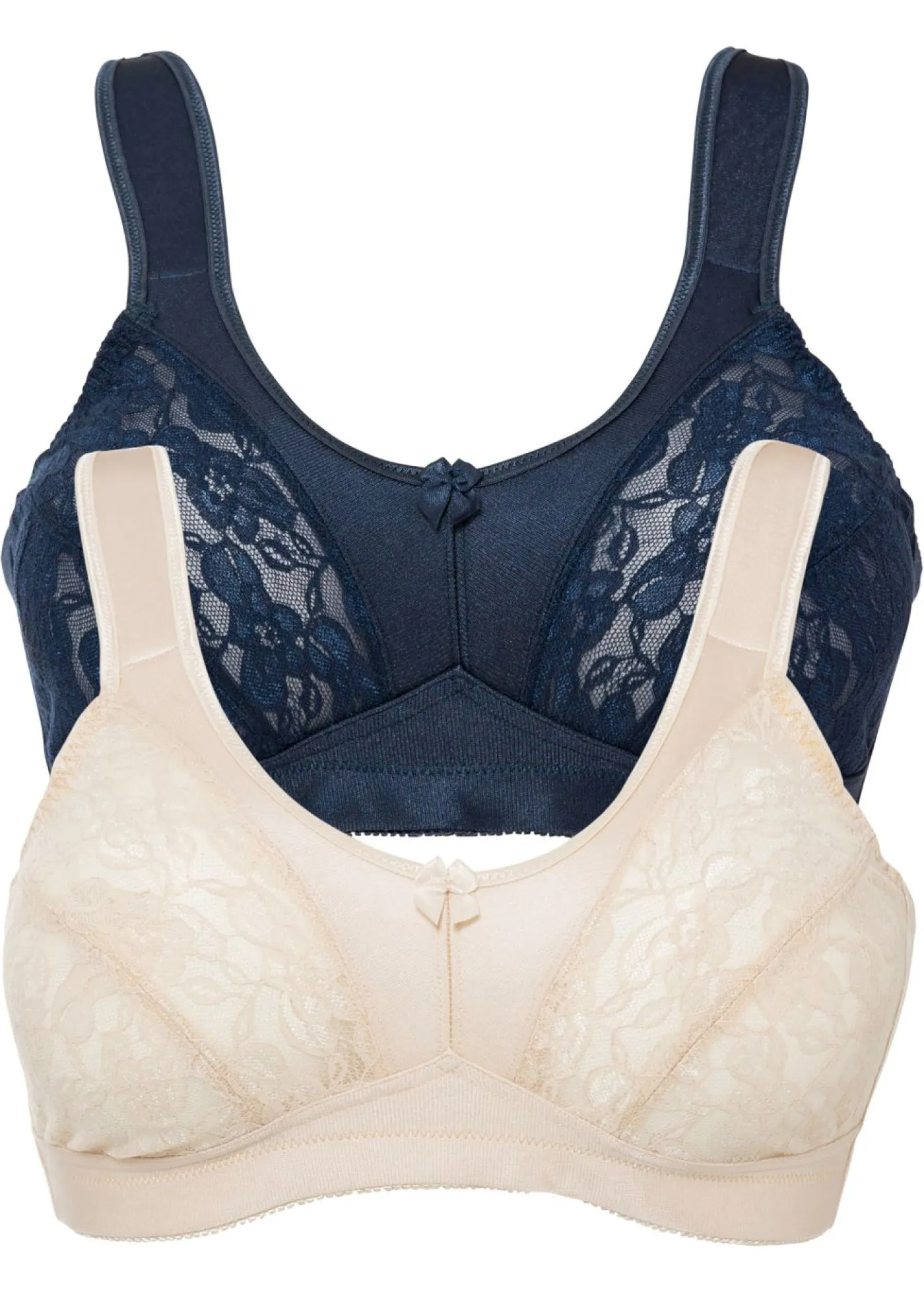 Sujetador sin aros con encaje sofisticado. Sujetador sin aros en un atractivo paquete doble. Los tirantes acolchados alivian los hombros y confieren a una sujeción segura. Las copas están decoradas con encaje de gran calidad.