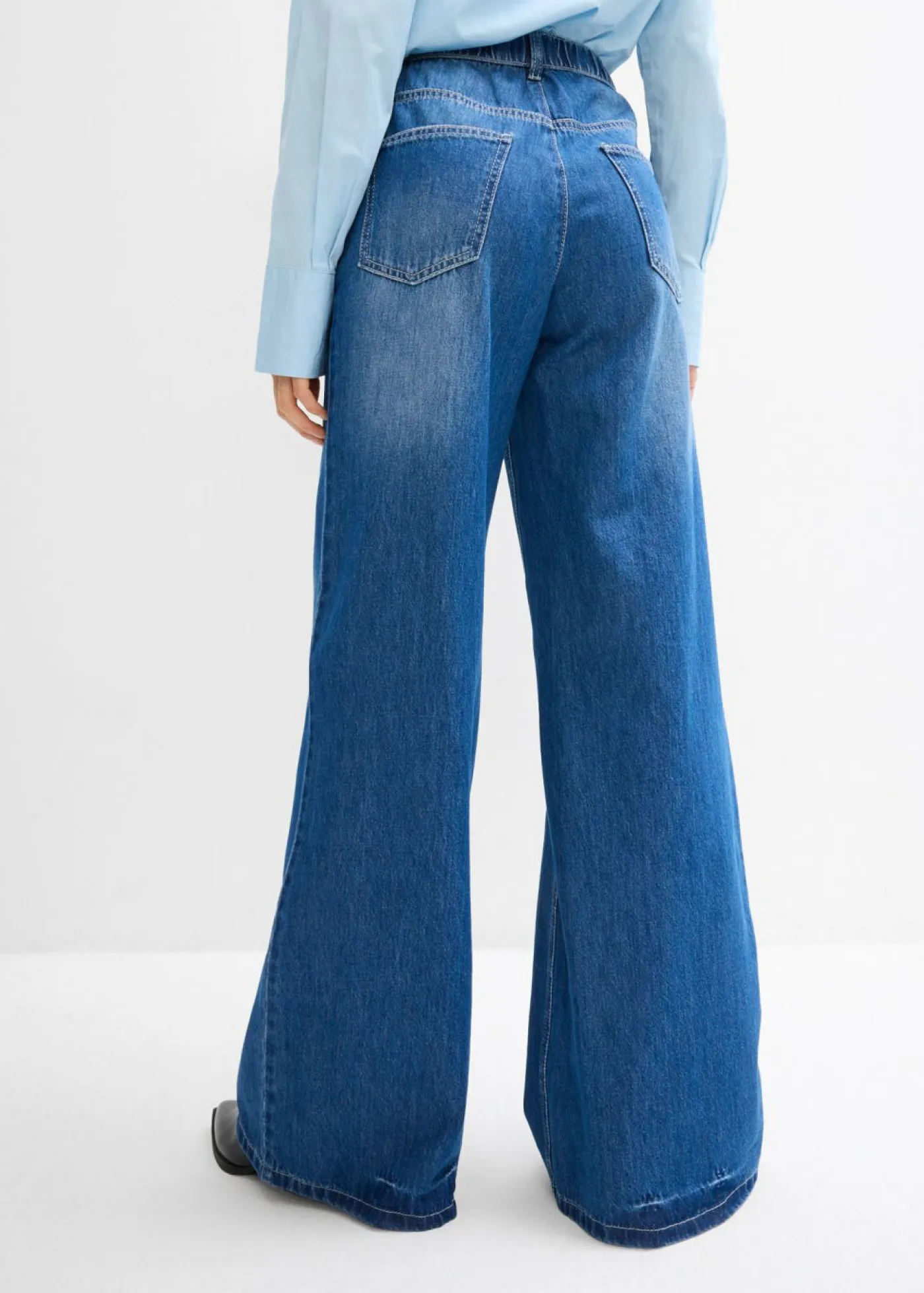 Vaqueros de pernera ancha, high waist, cintura cómoda. Vaqueros anchos de 5 bolsillos con cintura elástica de cuentas, confeccionados en un tejido vaquero de algodón firme que al principio resulta un poco rígido, pero que se vuelve más suave y suelto con el uso frecuente. Cintura alta con bragueta de cremallera y botón. Largo que crea un ligero efecto de apilado en el pie. Largo interior de pierna en talla 42 de aprox. 82,5. Se puede lavar a máquina.