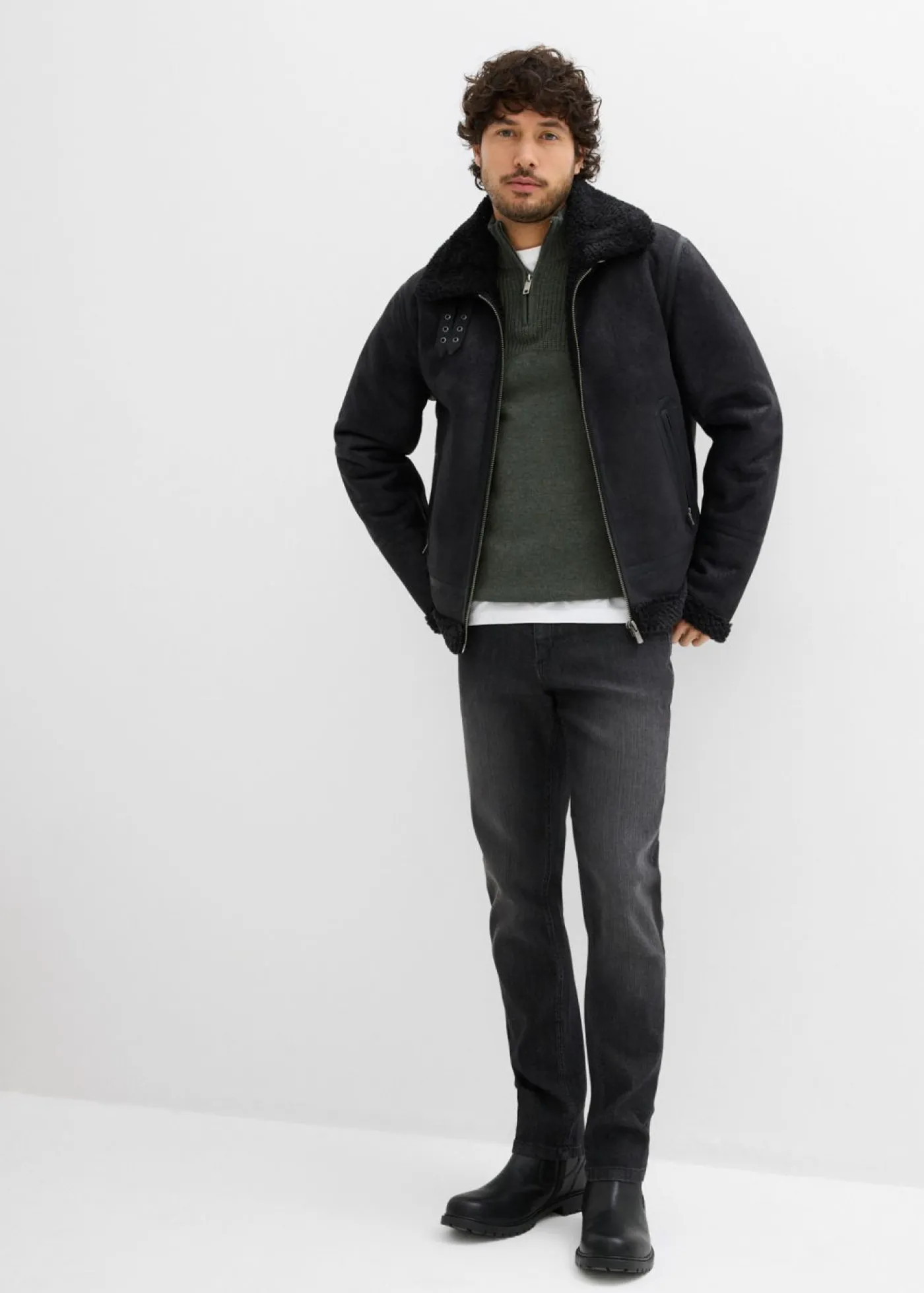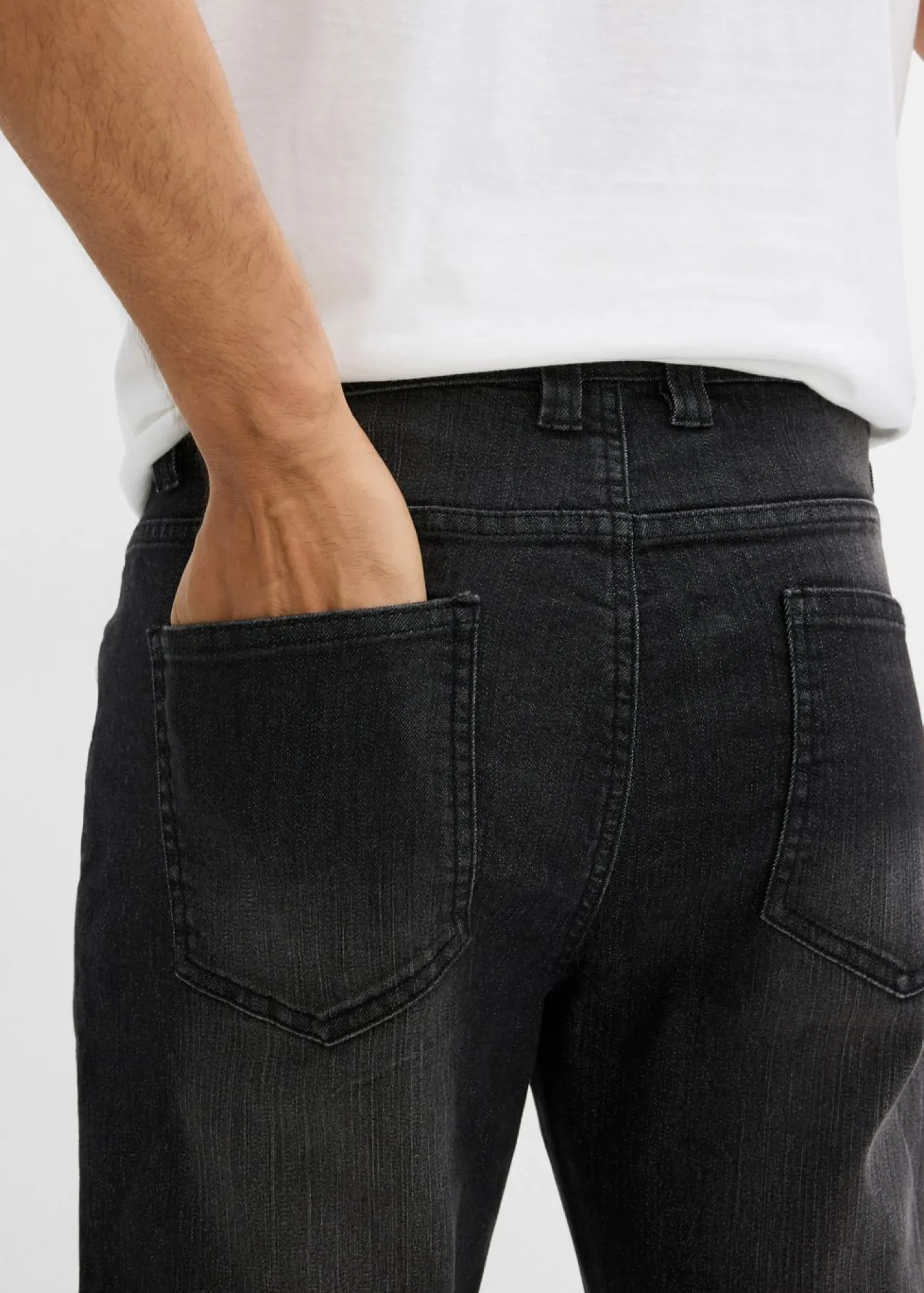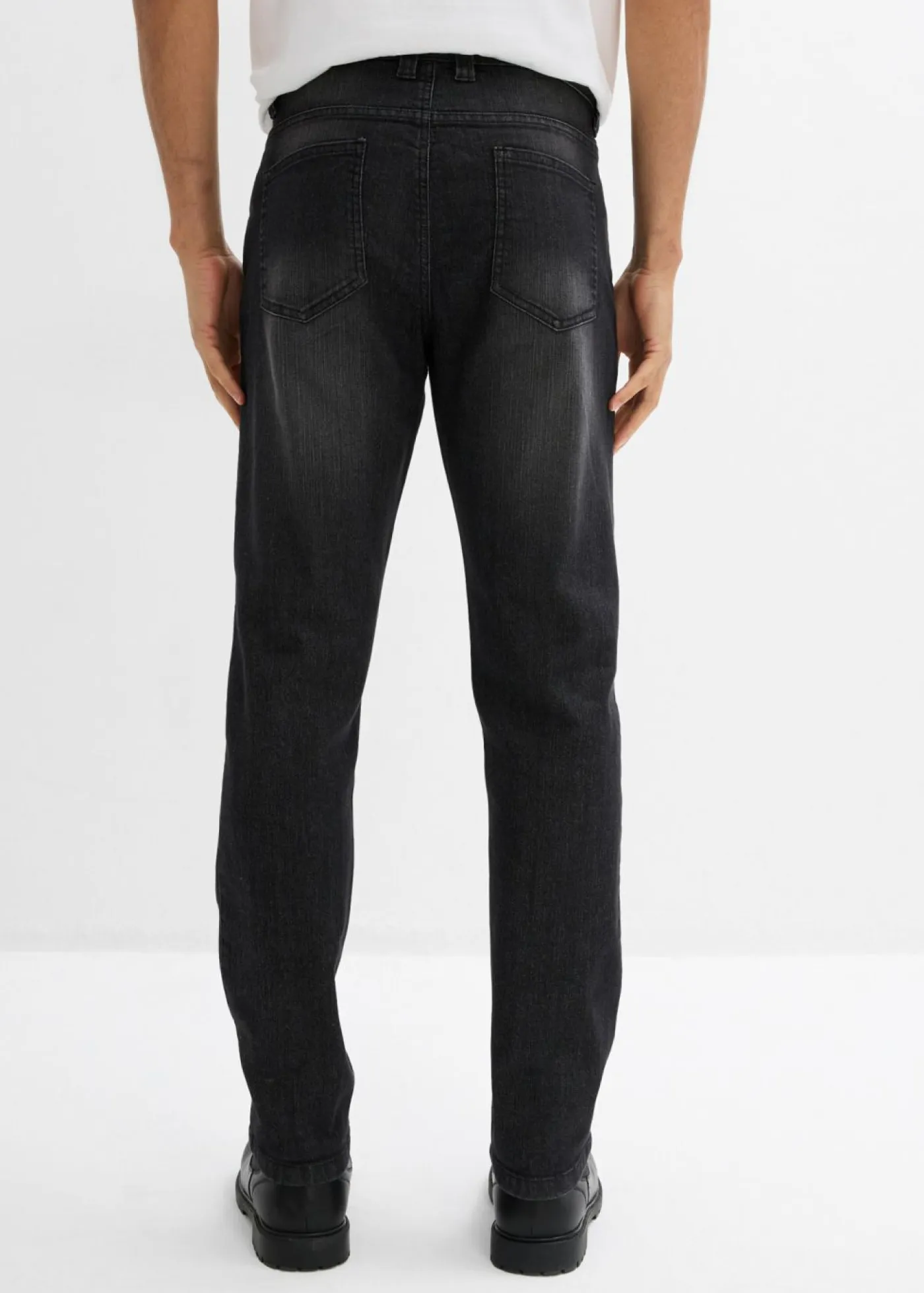 Modernos vaqueros elásticos de corte slim y recto con ligero lavado.