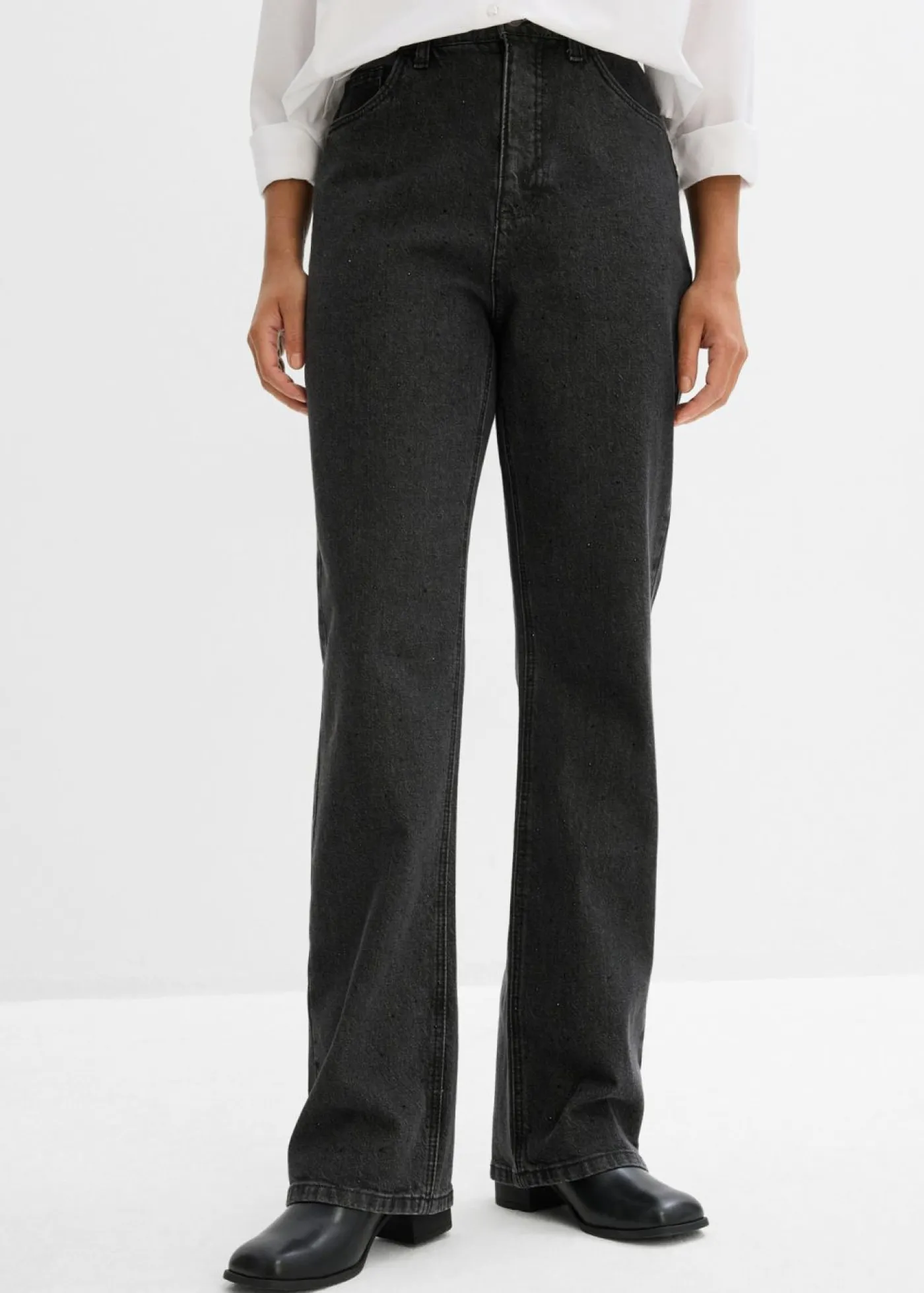 Vaqueros rectos de talle medio con corte holgado, cinturilla elástica y piedras brillantes, Largo. regular
