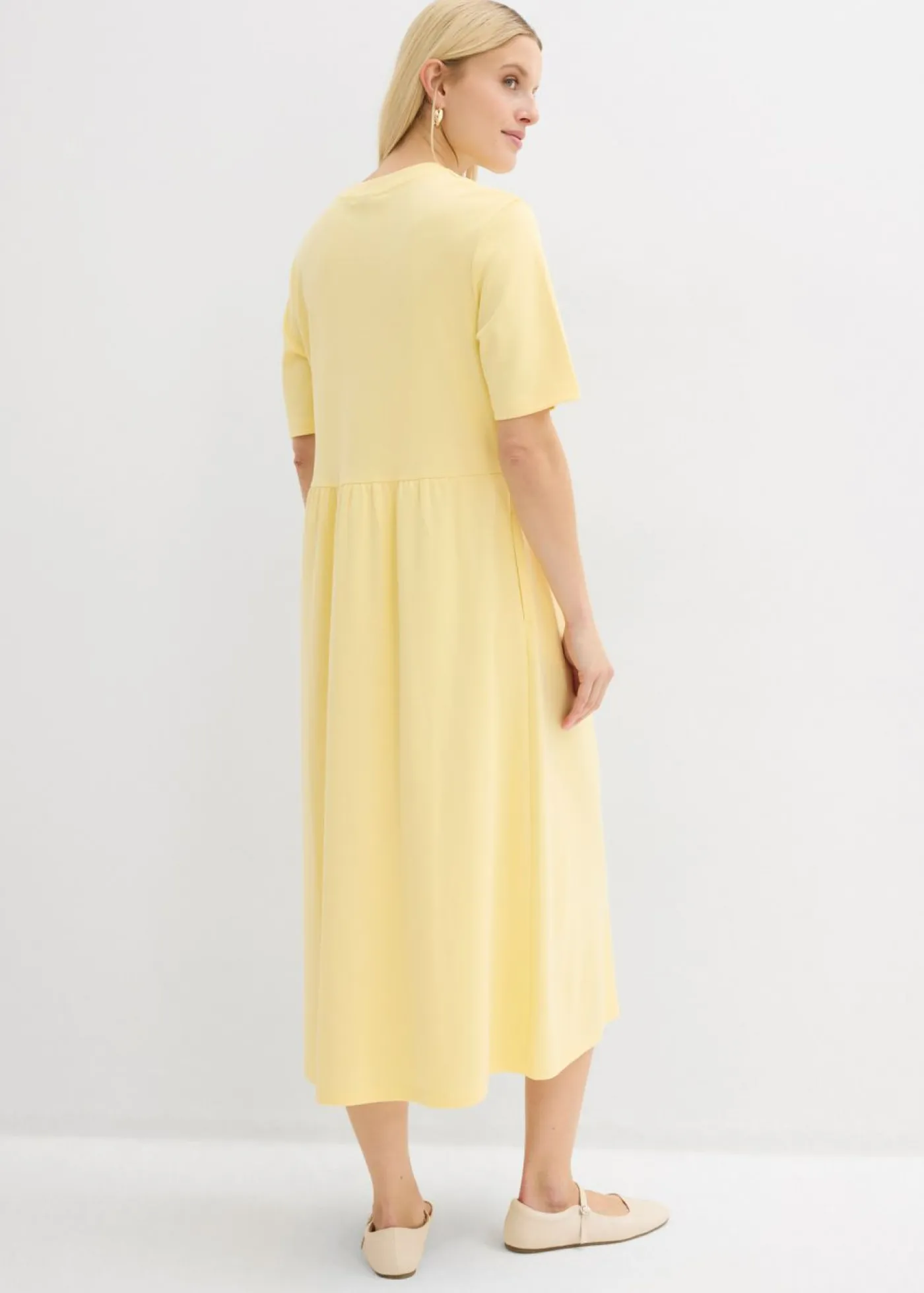 Vestido acampanado de punto con abertura lateral, cuello redondo alto y medias mangas.