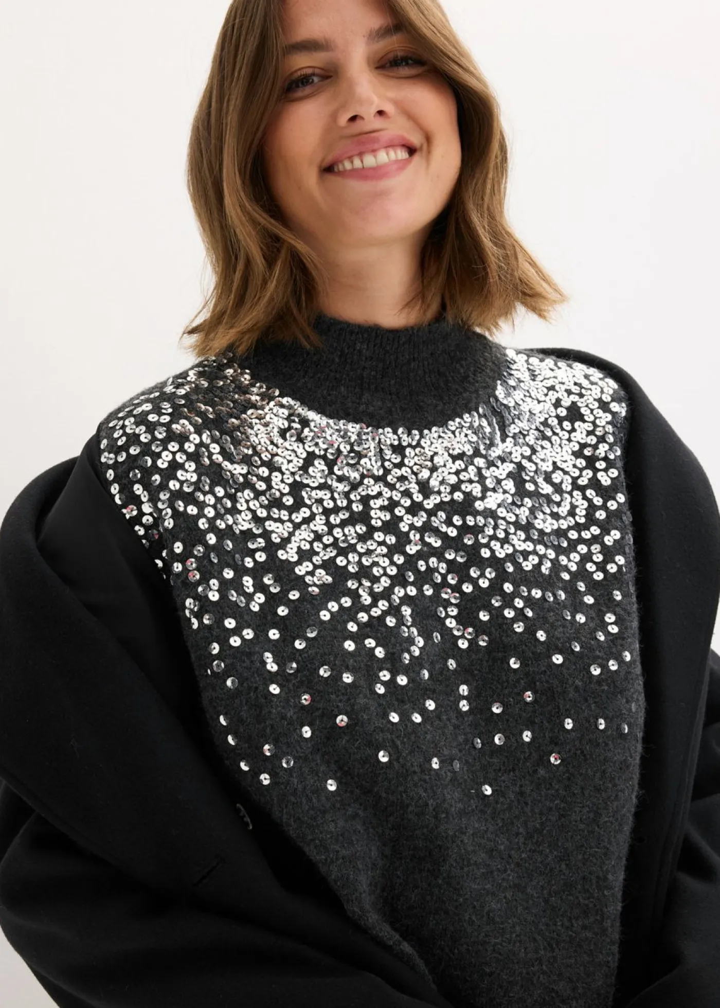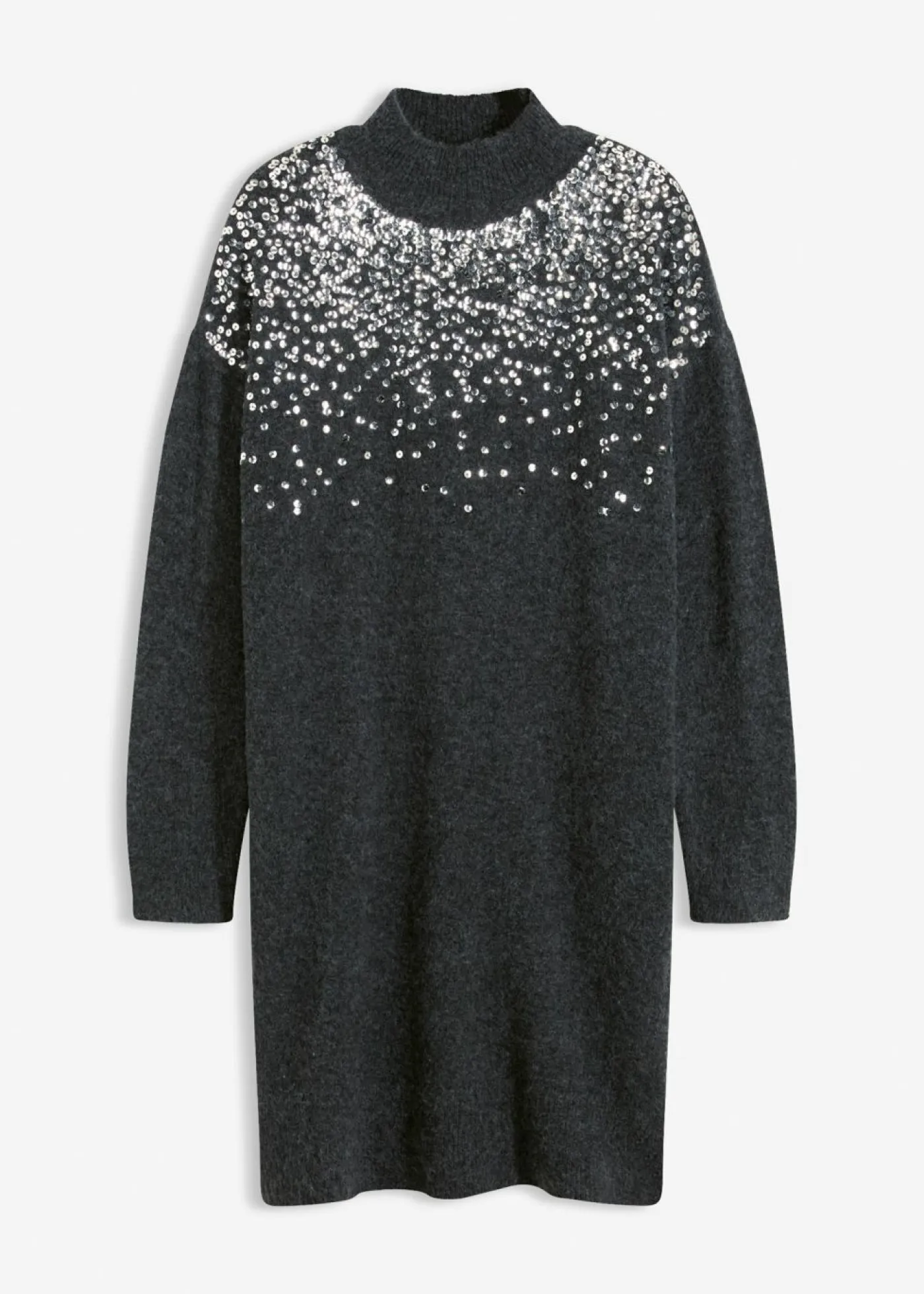 Vestido corto de punto con lentejuelas decorativas en la parte delantera.