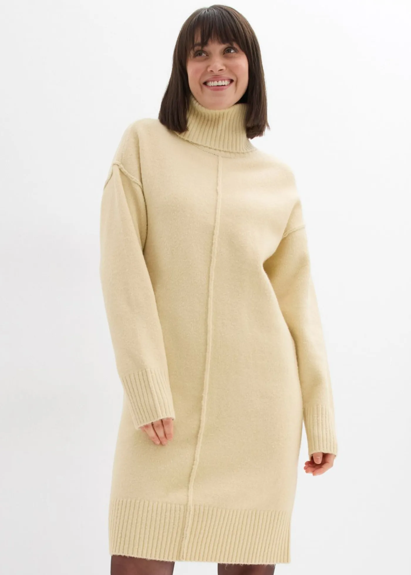 Moderno vestido de punto con cuello vuelto y costura decorativa.