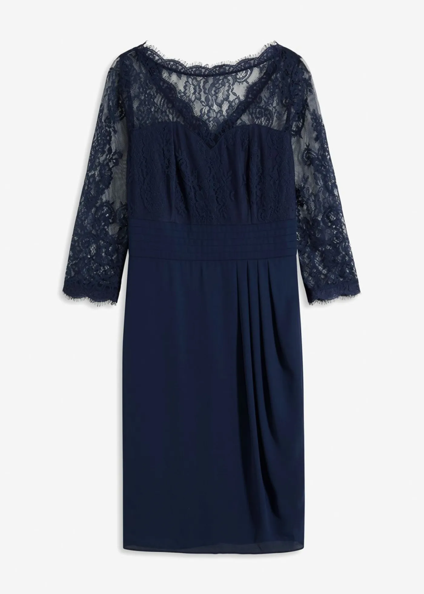 Vestido corto con falda drapeada y encaje en la parte superior con efecto ondulado en el escote y en las mangas.