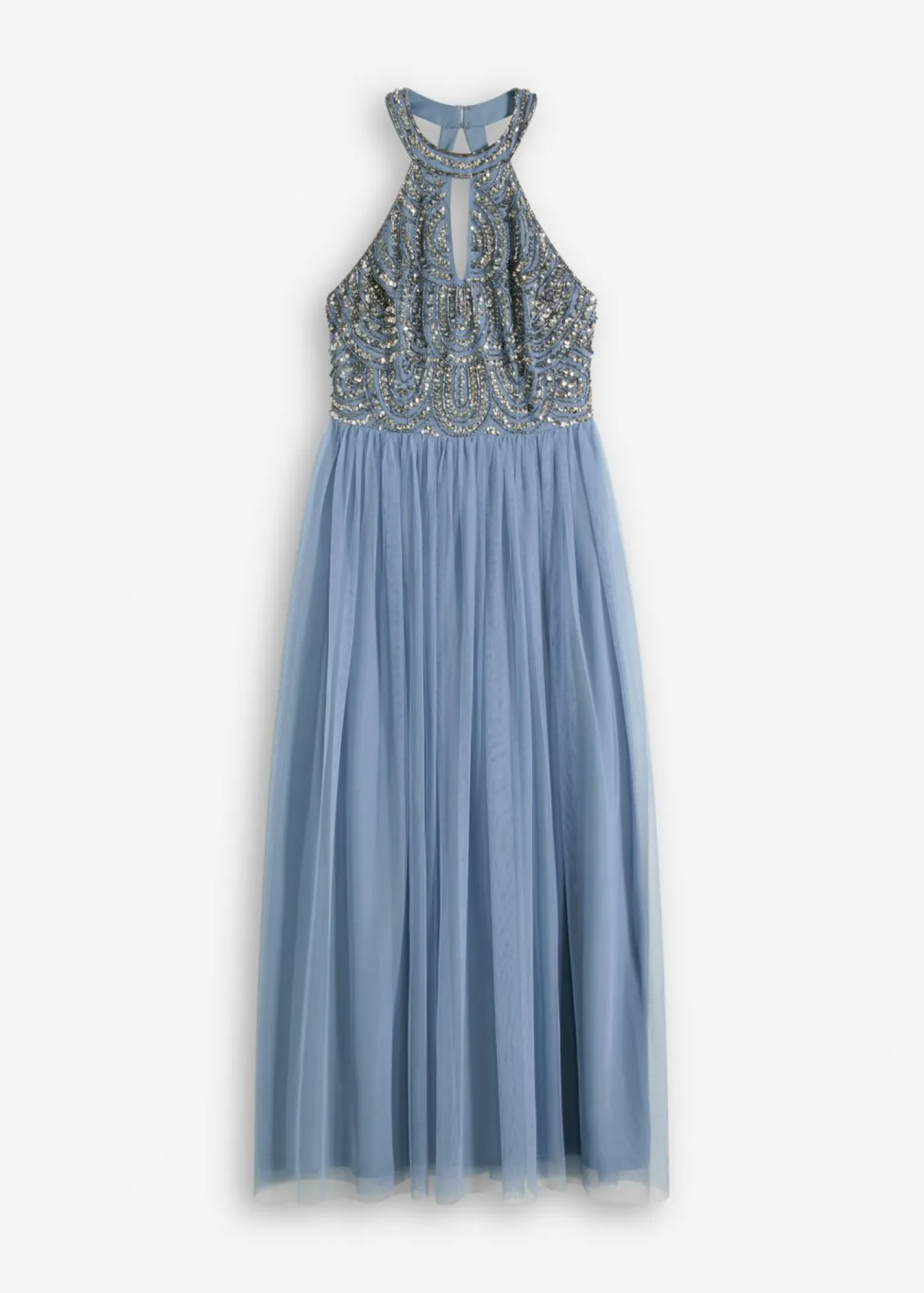 Moderno y femenino: Vestido de noche con cuello halter y escote keyhole, además de un encantador bordado de lentejuelas.