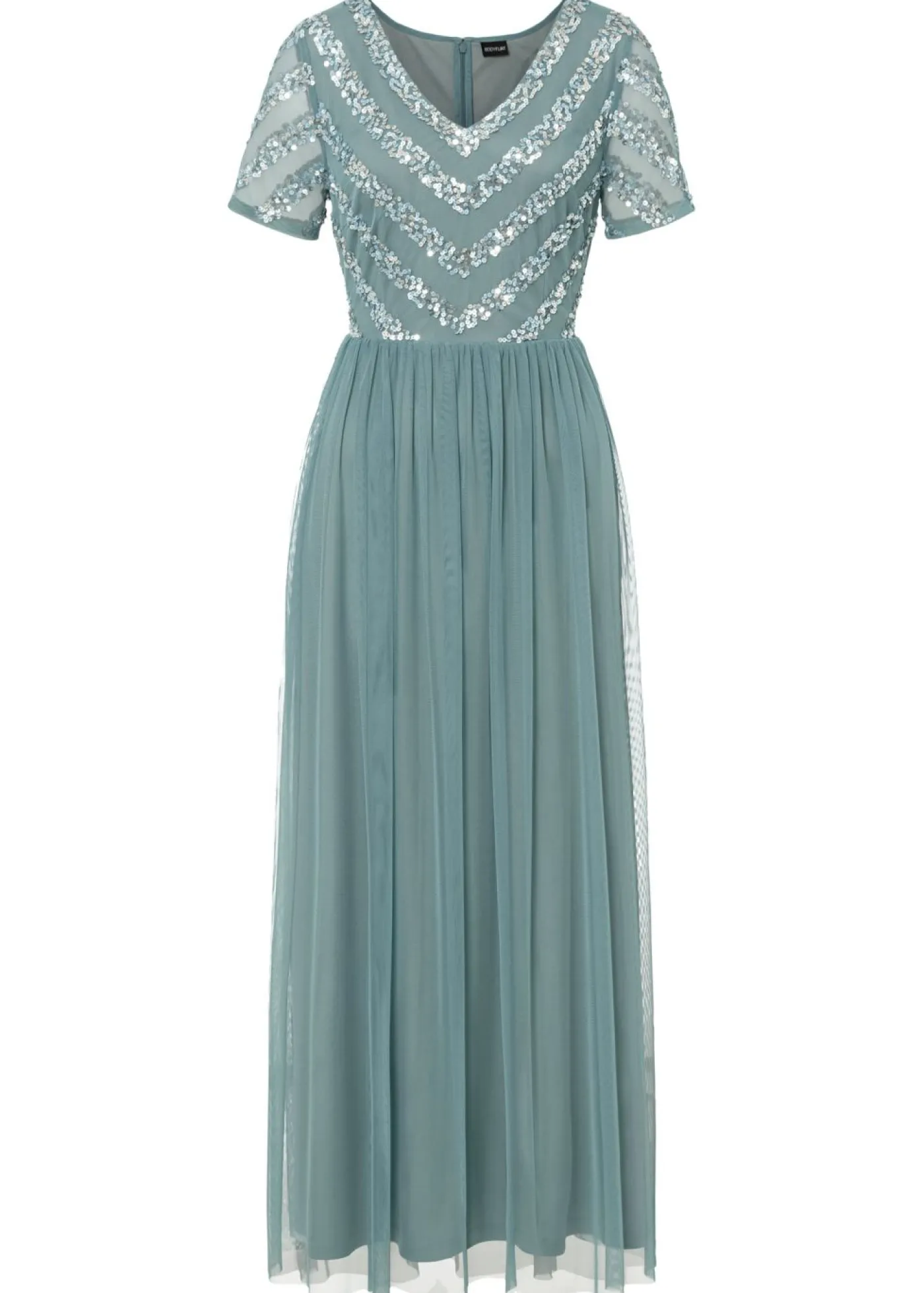 Elegante vestido de tul con patrón de lentejuelas bordadas. Vestido moderno de BODYFLIRT. El vestido largo está confeccionado con lentejuelas. También presenta una cremallera en la parte trasera. Largo de aprox. 140 cm en talla 36/38.