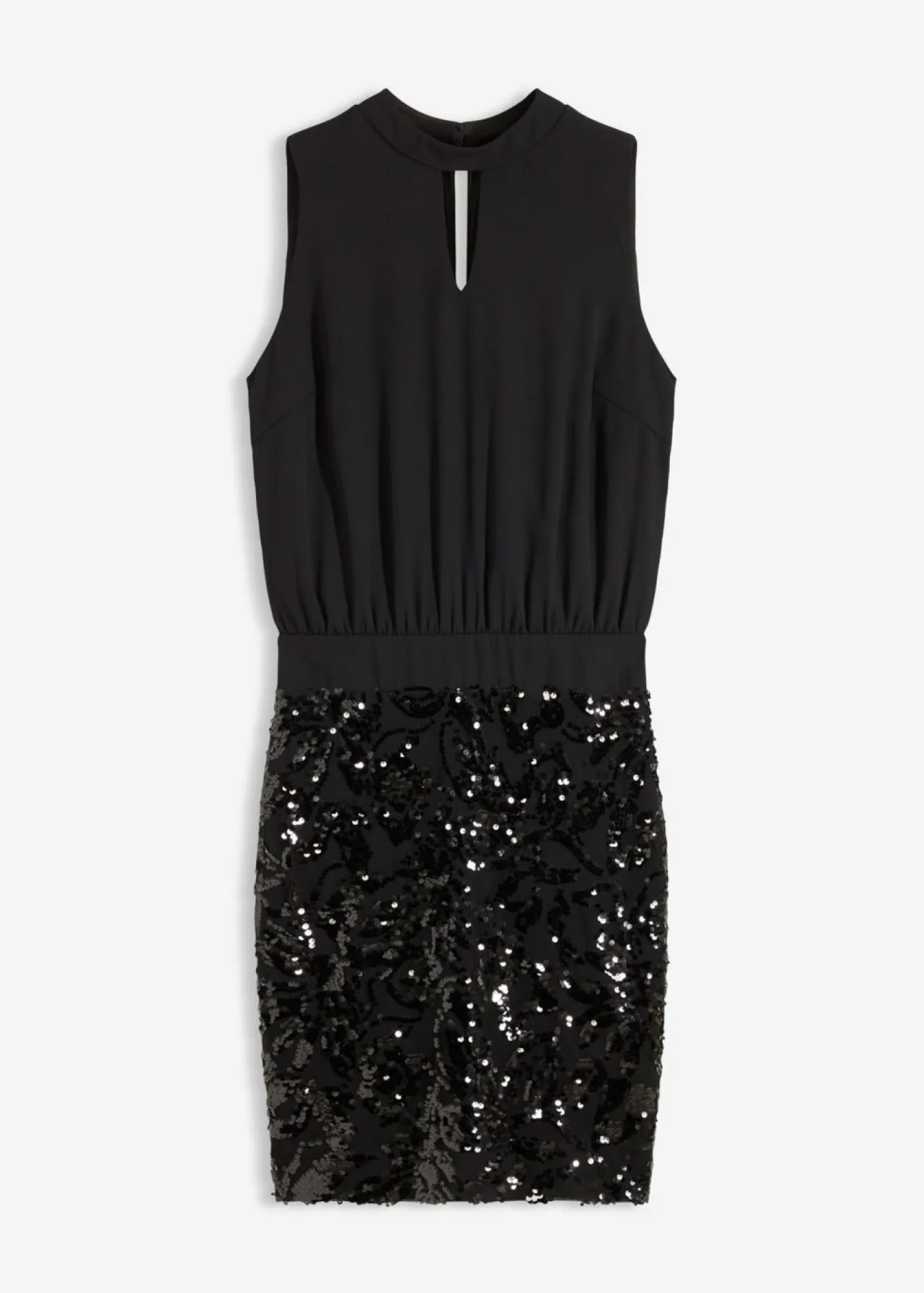 Moderno y femenino: vestido corto con bordado de lentejuelas en la falda y parte superior brillante.