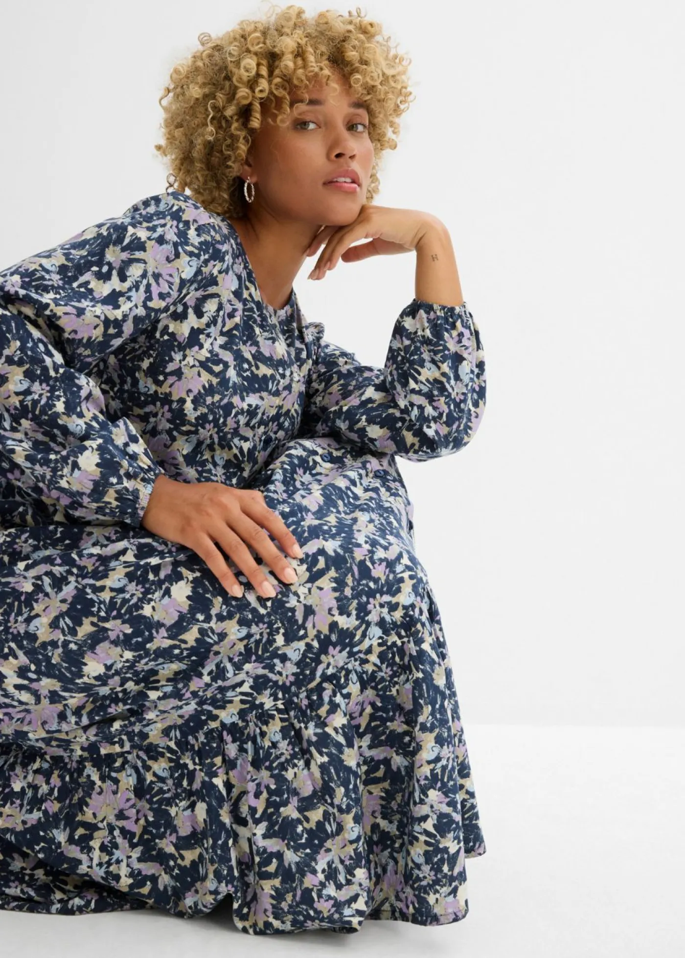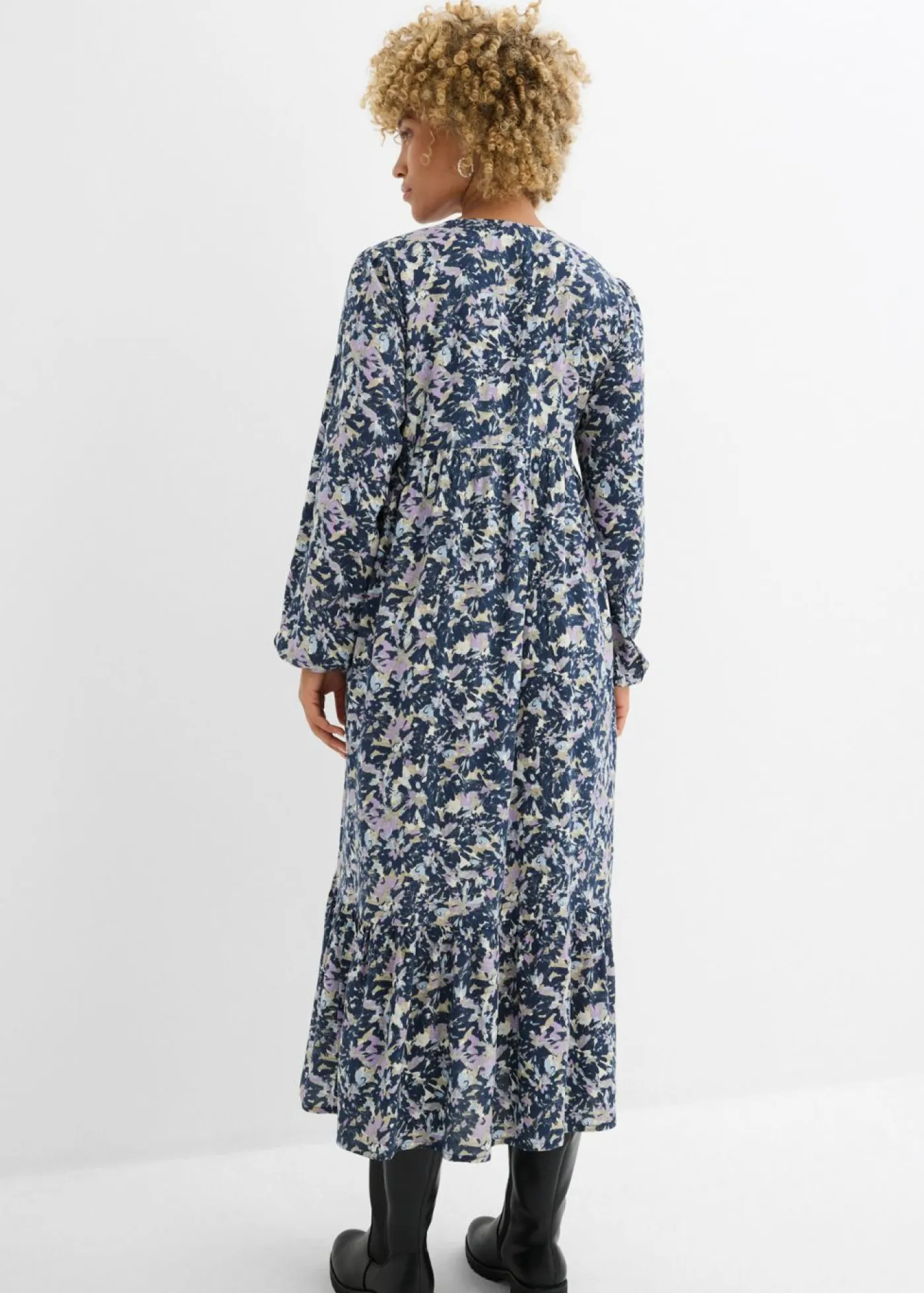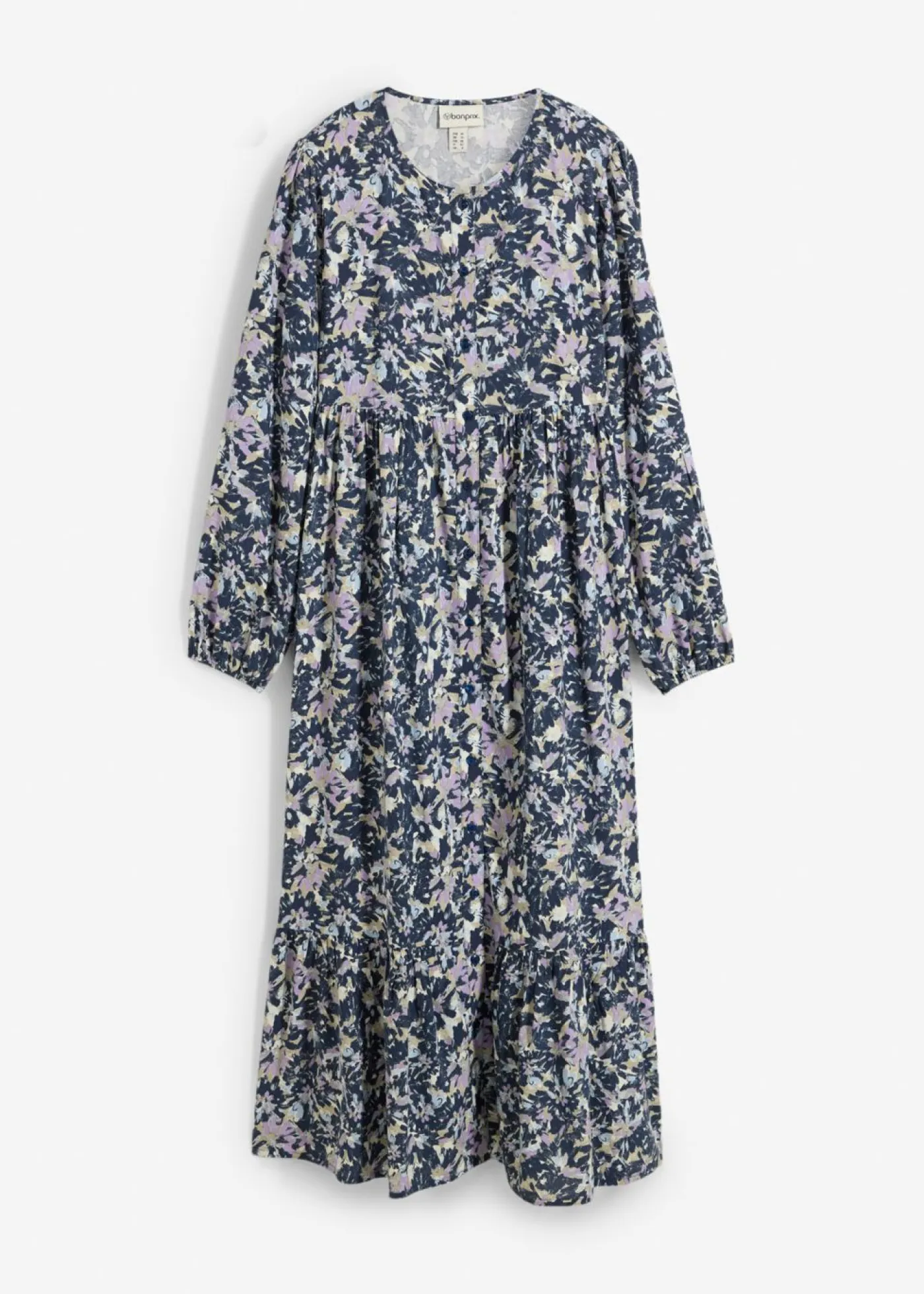 Vestido tipo blusa con ligero corte en A. Con cierre elástico en los puños y estampado floral. Largo de aprox. 126 cm en talla 42. Se puede lavar a máquina.
