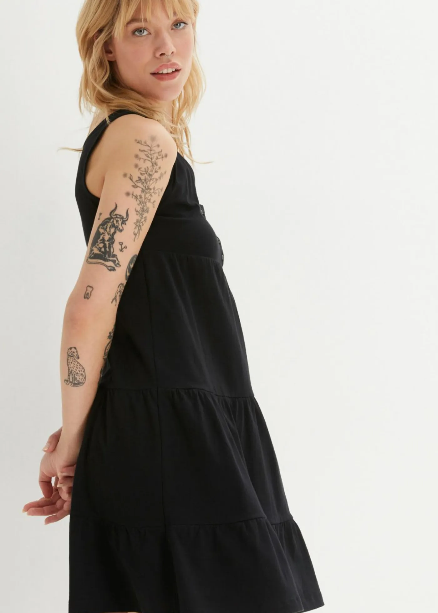 Cómodo vestido con largo a la moda y botones en el pecho. Vestido evasé de punto, con tapeta de botones y minibolsillo en el pecho. Lavable a máquina. Largo aprox. 92-102 cm.