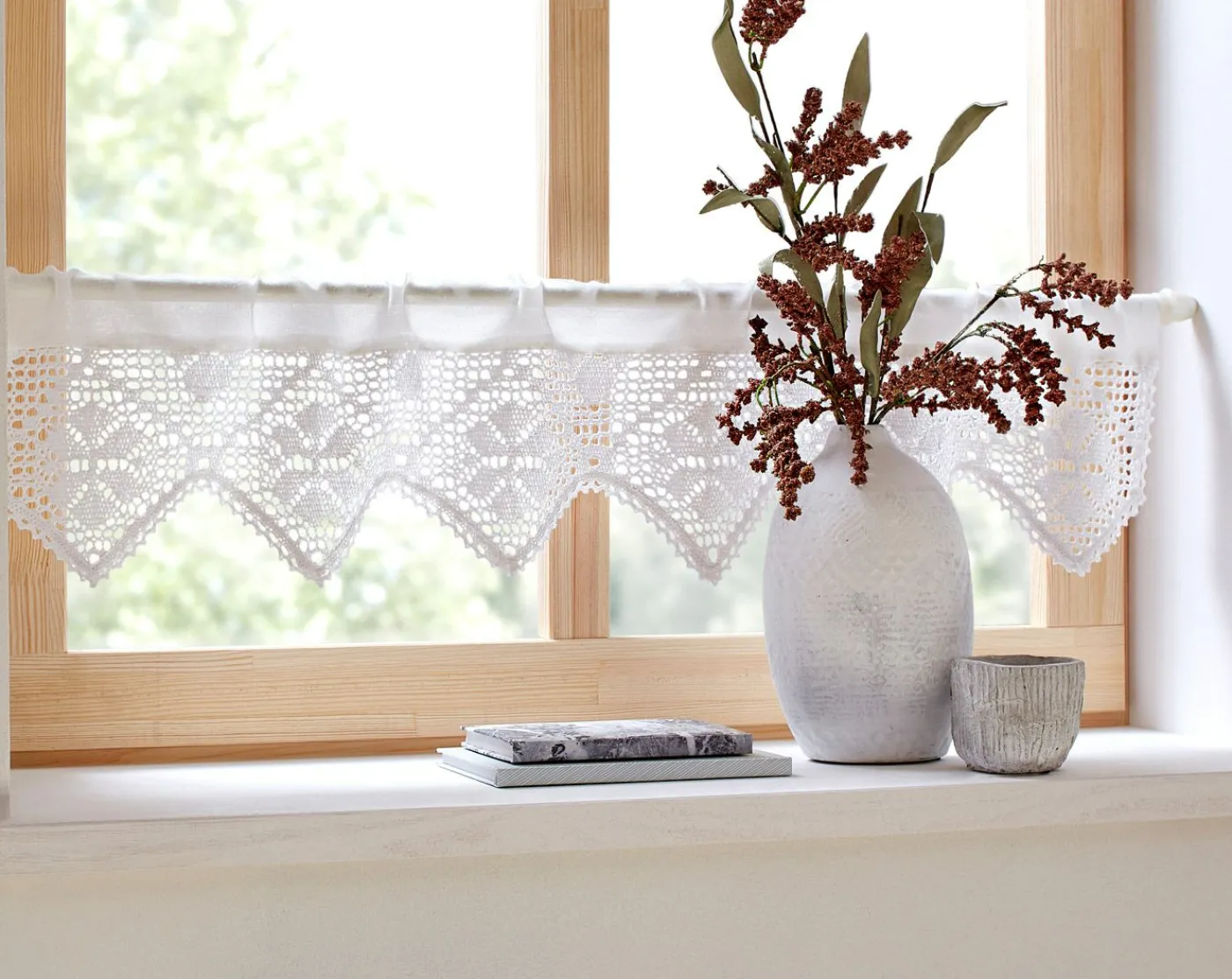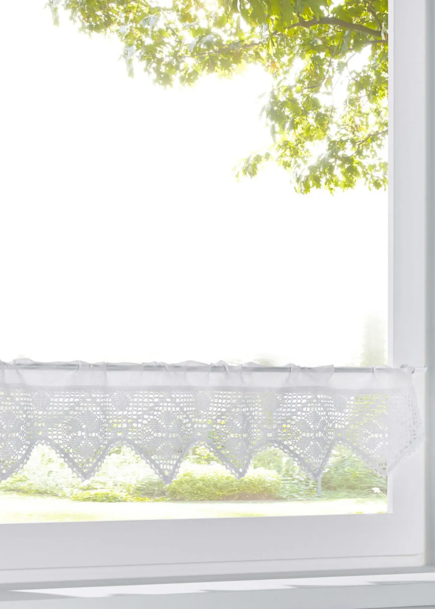 Una decoración muy especial para las ventanas. Visillo especial de ganchillo. Es transparente y se ha tejido finamente para que también pueda utilizarse como camino de mesa o para otras cuestiones. Como dispone de un dobladillo con vaina, podrás colocarlo en un santiamén. Dimensiones del tejido: 20 cm de altura y 90 cm de anchura.