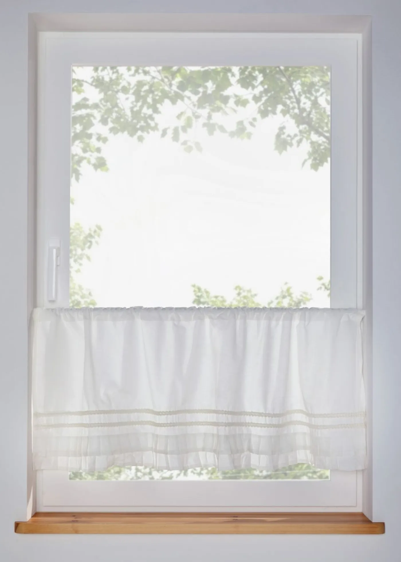Cortina romántica con volantes para cocina.