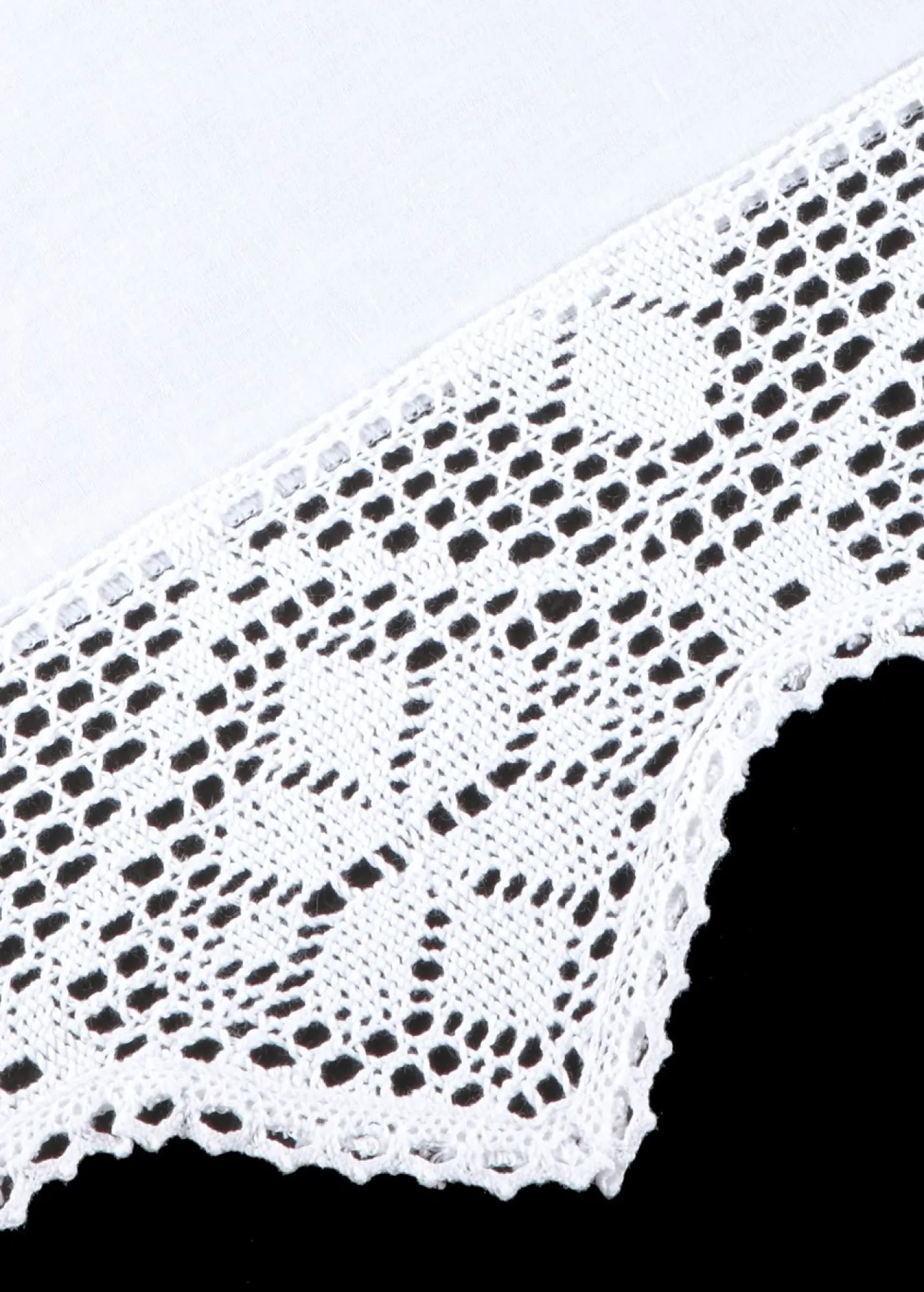 Cortinilla en tejido opaco con una ancha tira de encaje de ganchillo acabada en picos en la parte inferior que le da un aire muy refinado a la ventana. La medida corresponde a la tela.