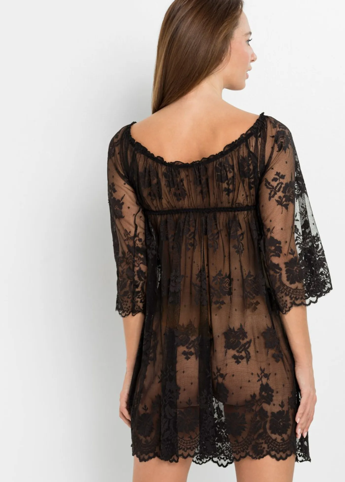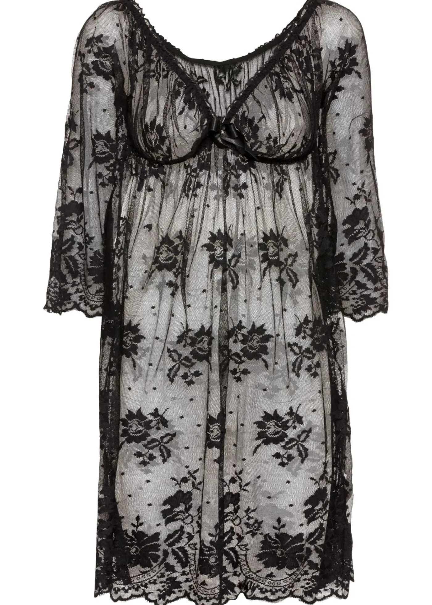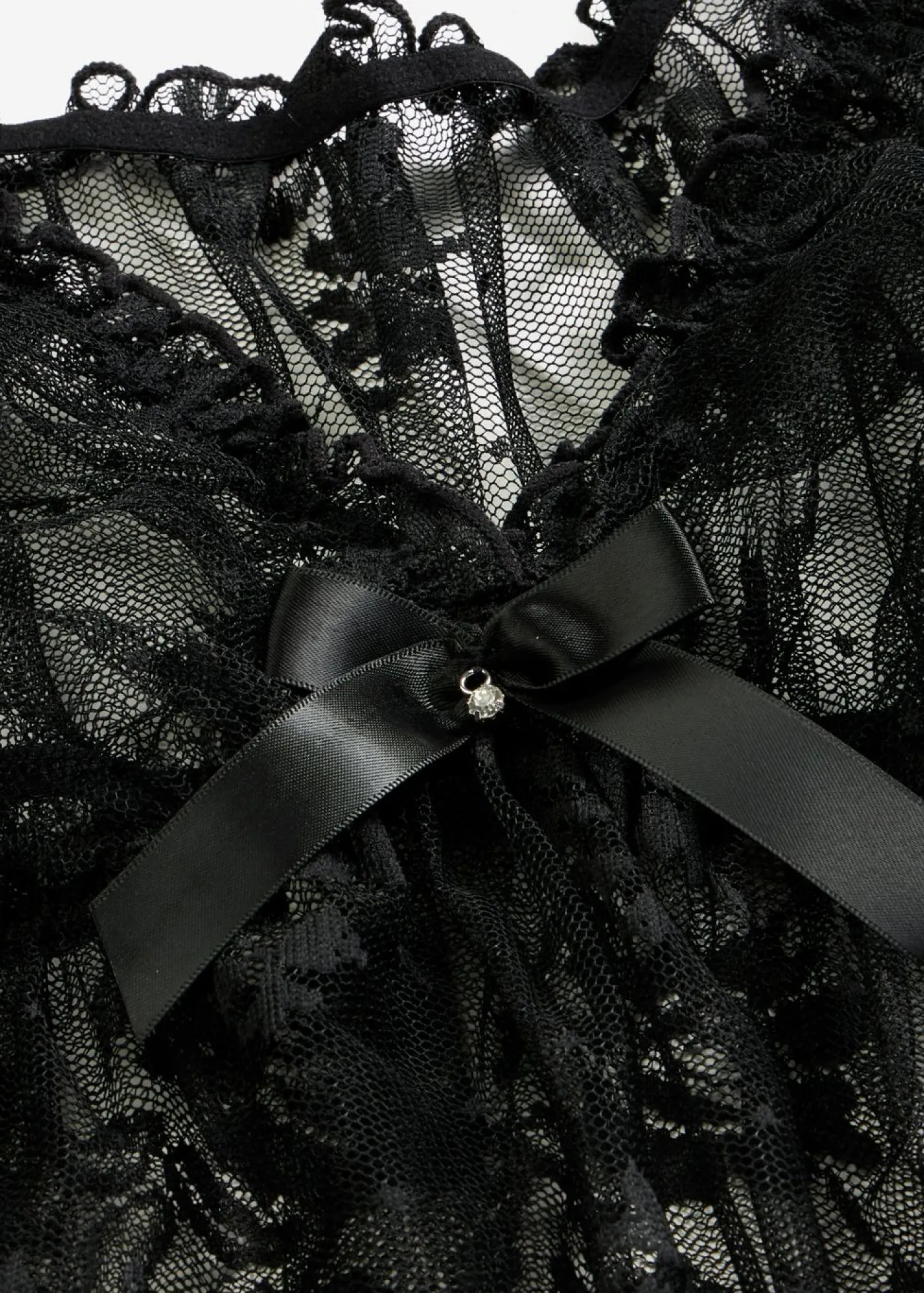 Negligé ligero de encaje. ¡Elegancia pura! Este negligé cubre las curvas femeninas dejando entrever el interior gracias a la suave transparencia de su tejido. El escote profundo en V rodea su escote terminando en un lazo decorativo en el centro. Este look romántico apasionará a su pareja. Este negligé también está disponible en tallas grandes.