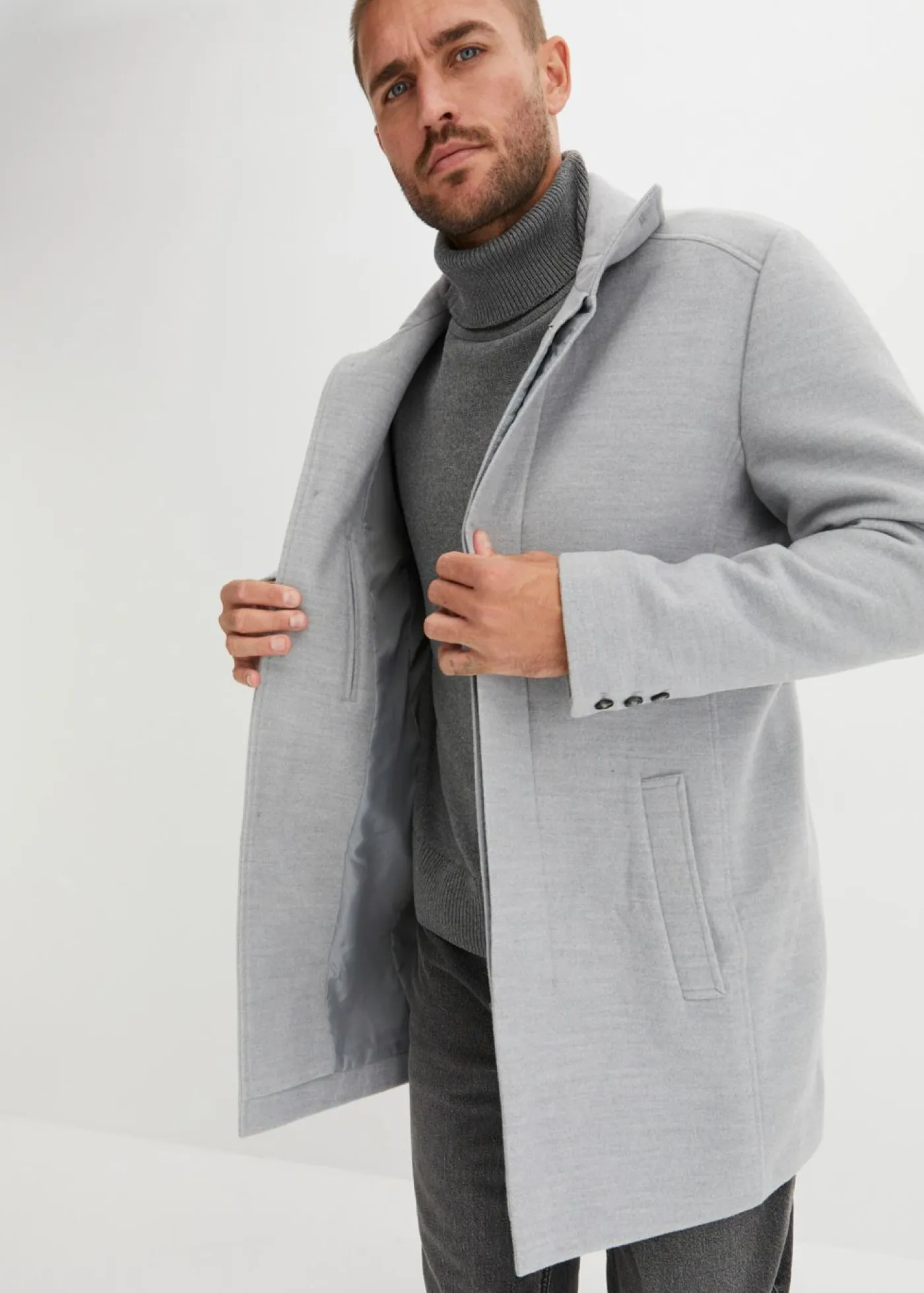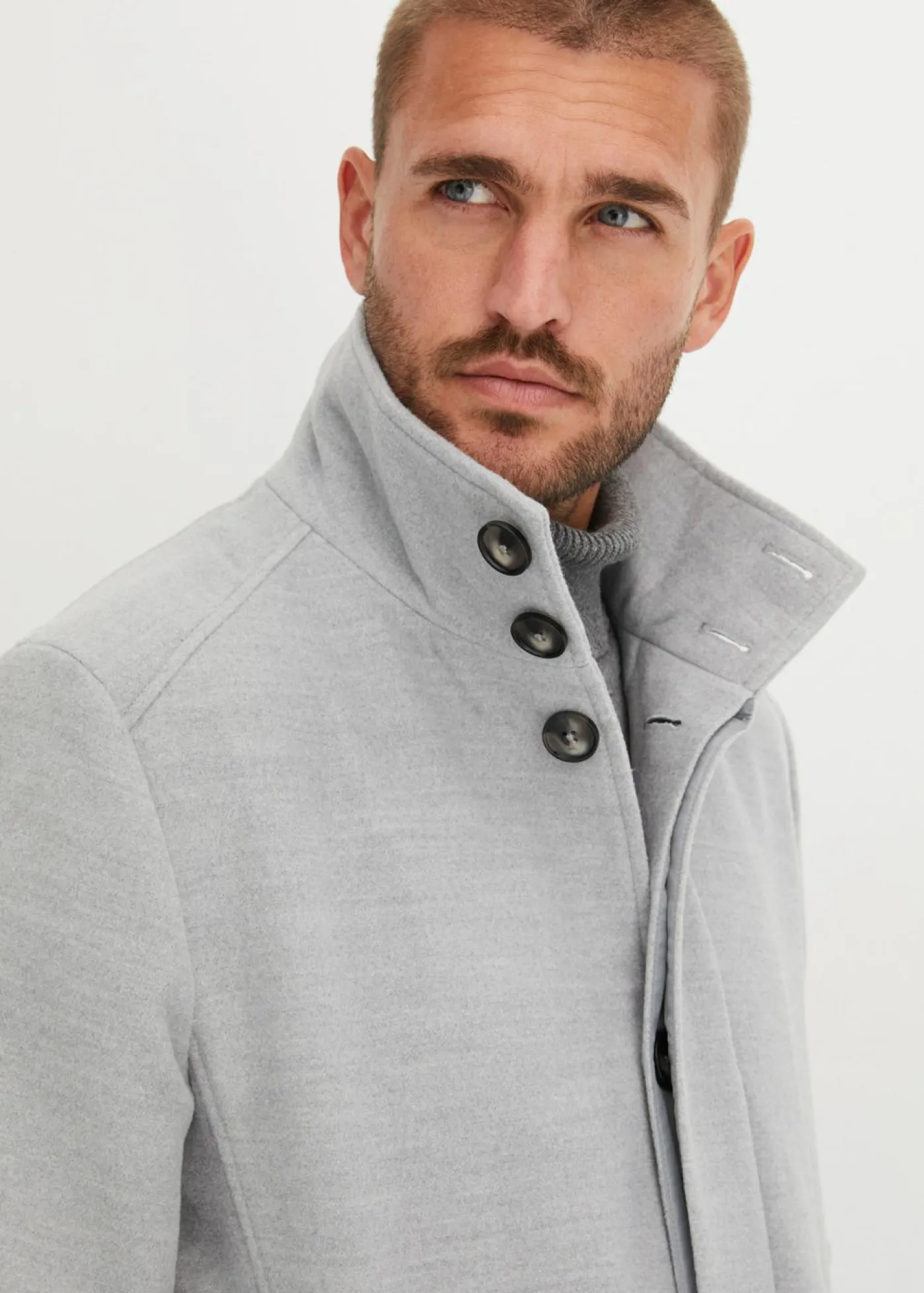 Moderno abrigo corto con aspecto de lana, cuello alto y botones ocultos.