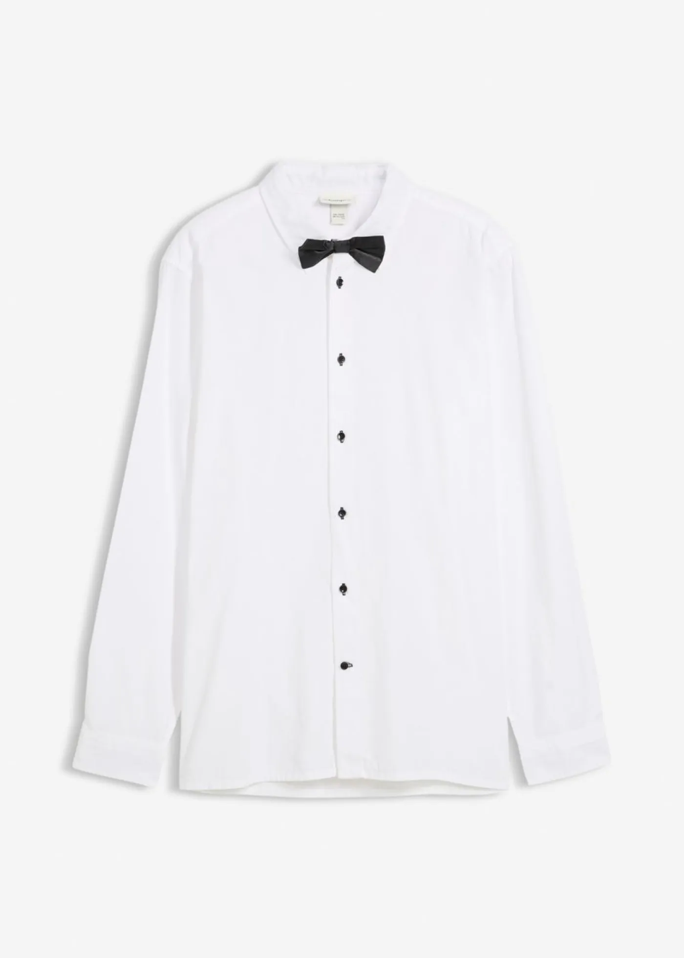 Elegante camisa con pinzas/camisa clásica de corte regular con botones negros y pajarita de satén a juego.