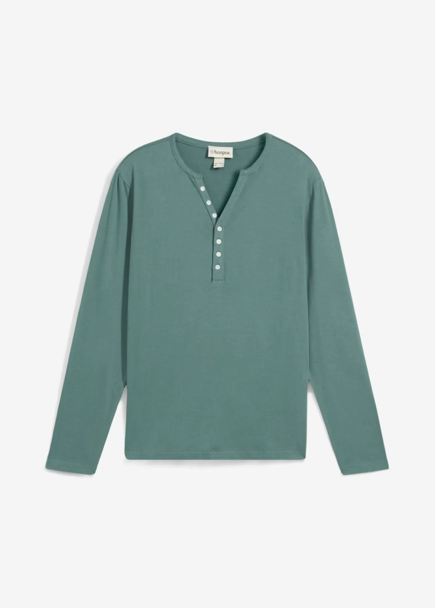 Camiseta de algodón orgánico puro con cuello henley, manga larga y corte entallado