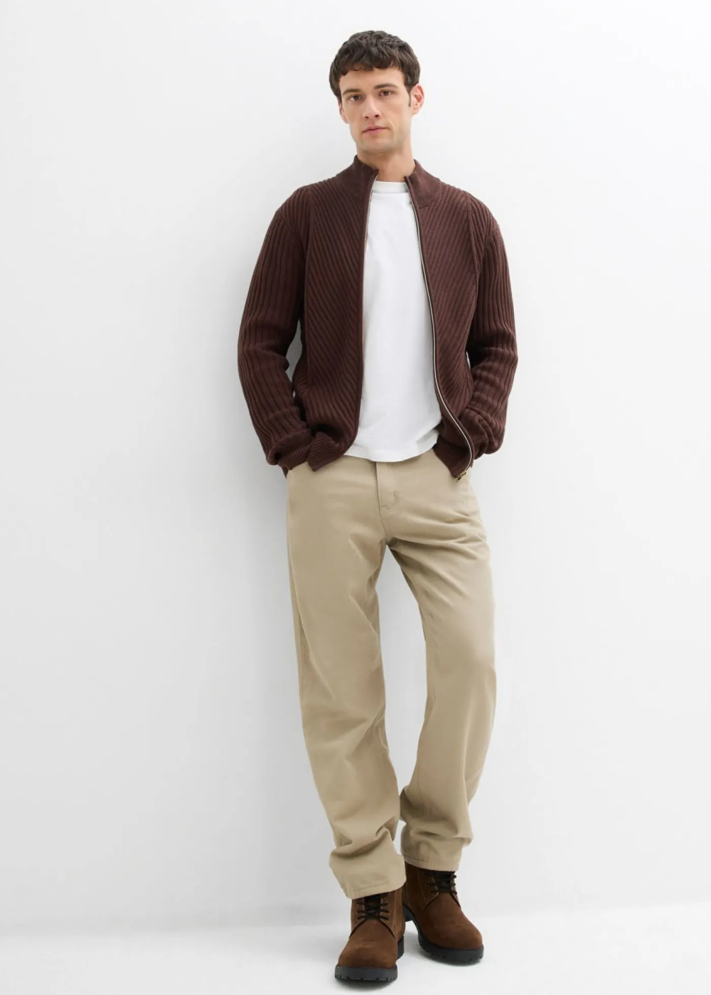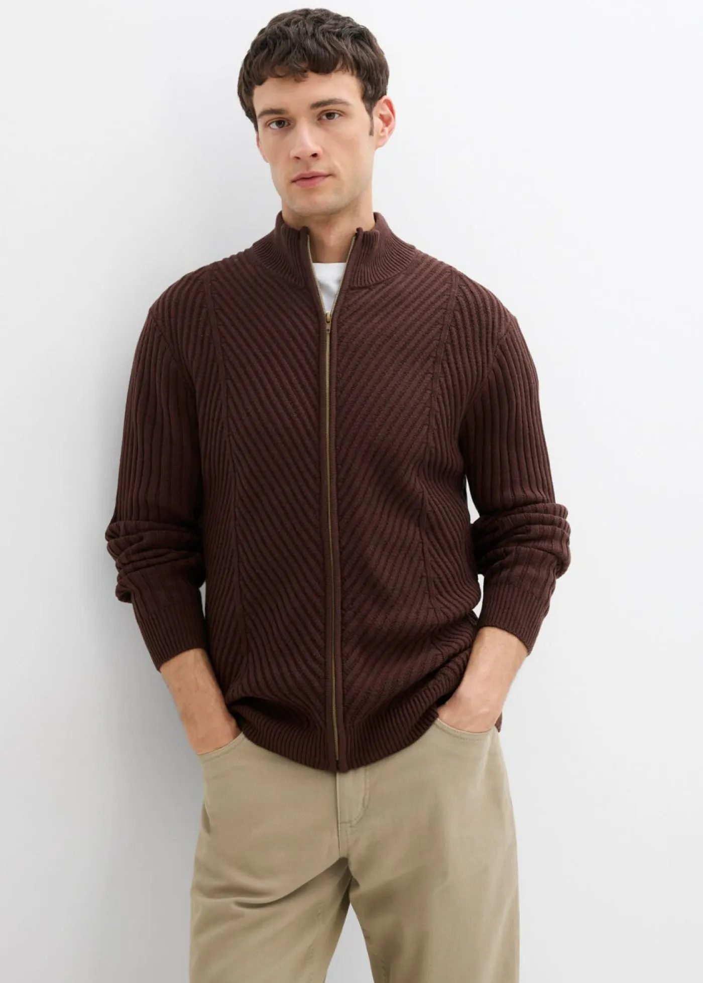 Chaqueta moderna de punto con corte regular, cuello alto y una llamativa cremallera metálica.