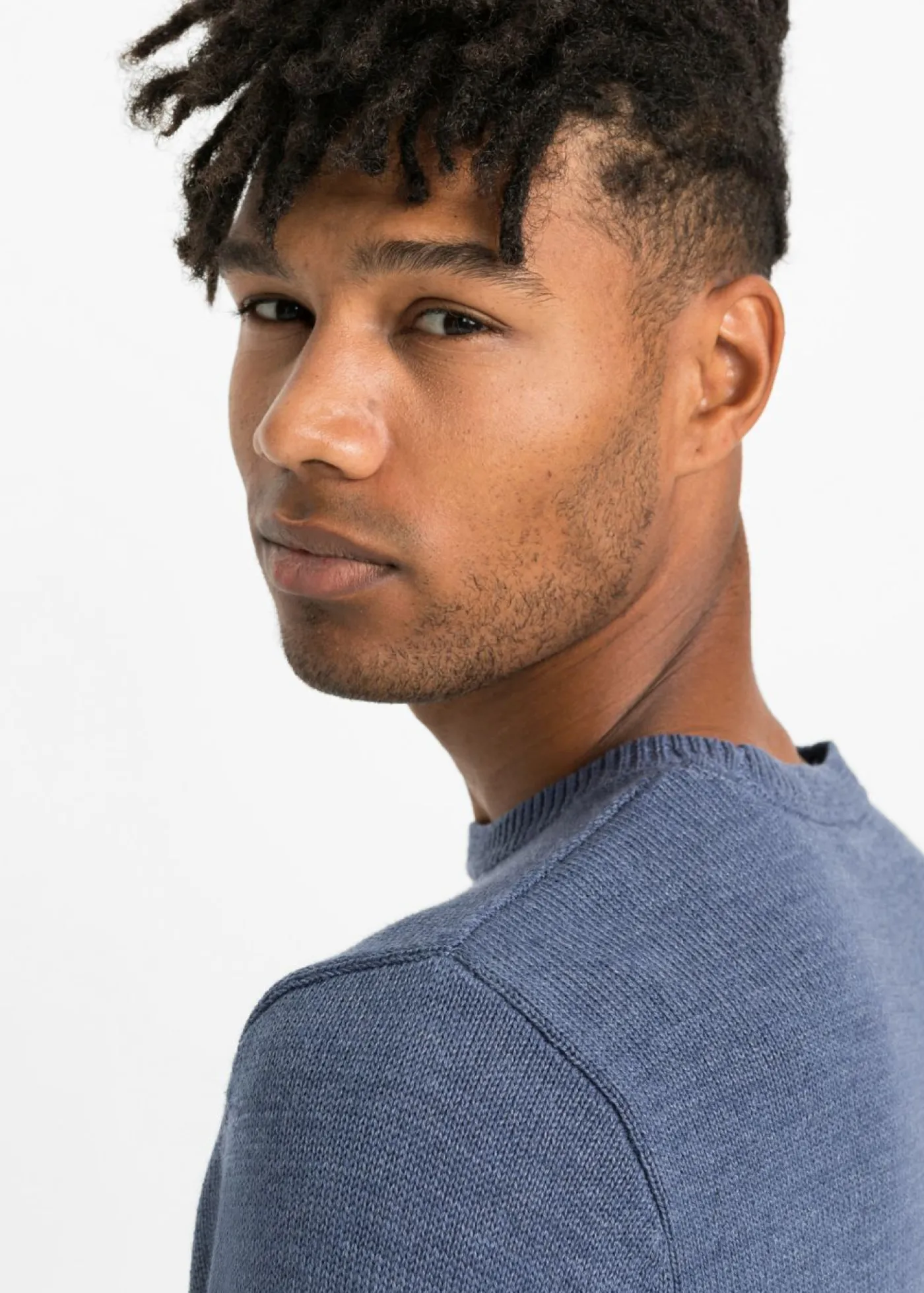 Jersey moderno con cuello redondo y detalles de piel sintética. Se puede lavar a máquina.