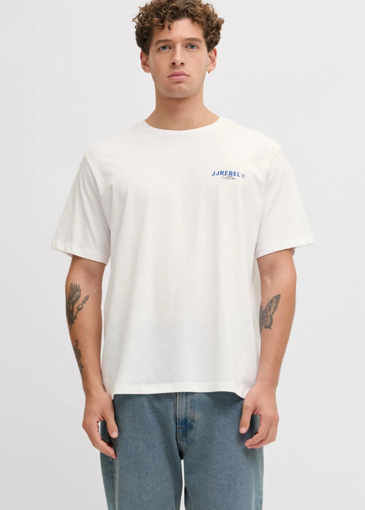 JJ REBEL: camiseta informal de estilo urbano con largo clásico y estampado en la parte posterior.