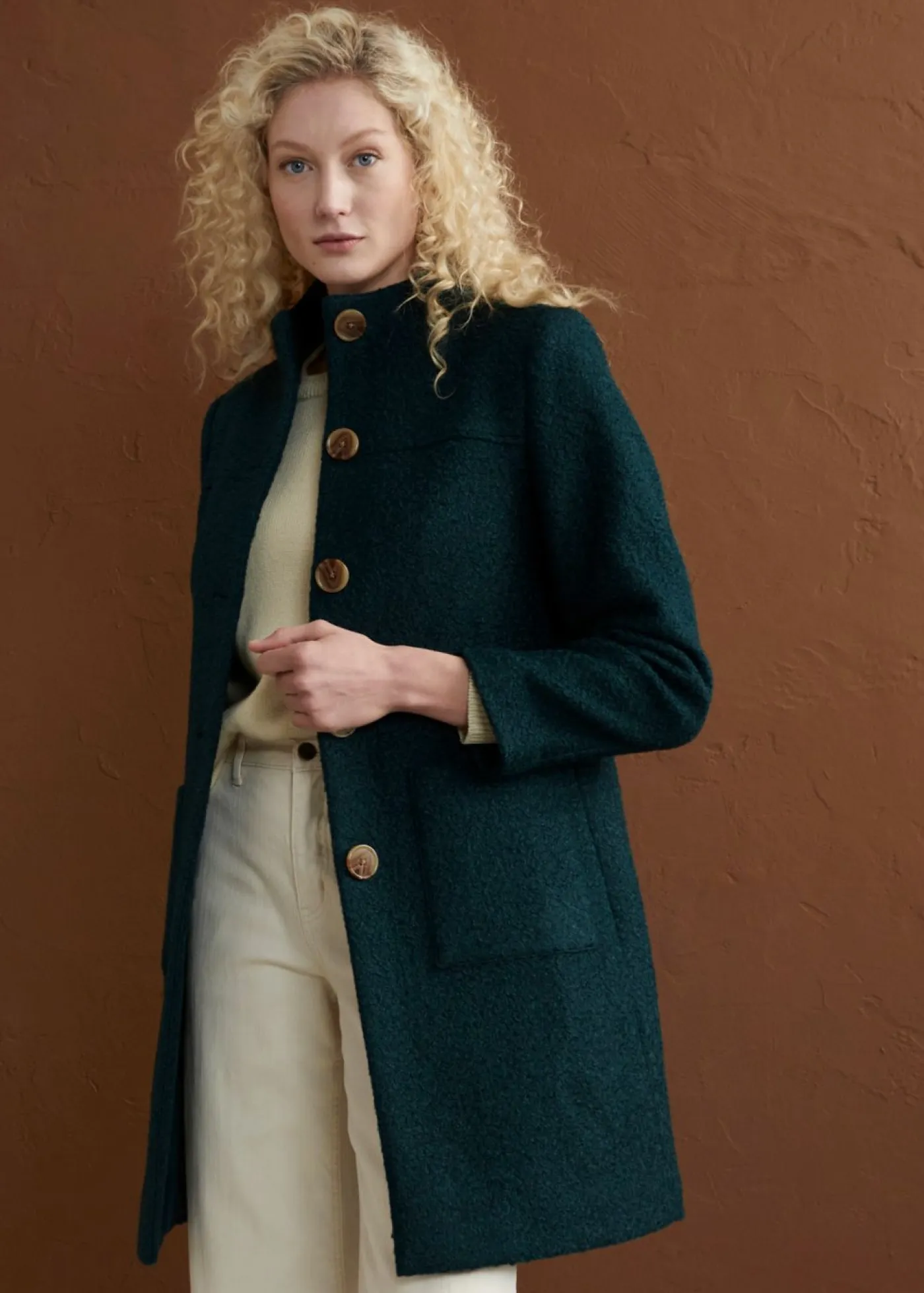 Abrigo estructurado con botones, cuello alto y favorecedora línea en A. Largo de aprox. 80 cm en todas las tallas. Se puede lavar a máquina.