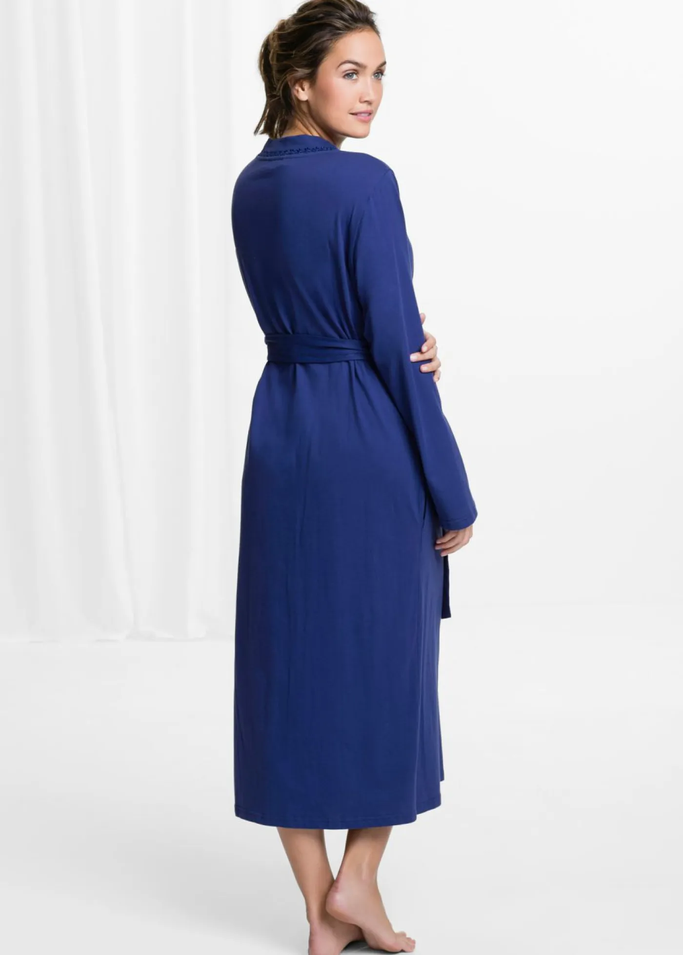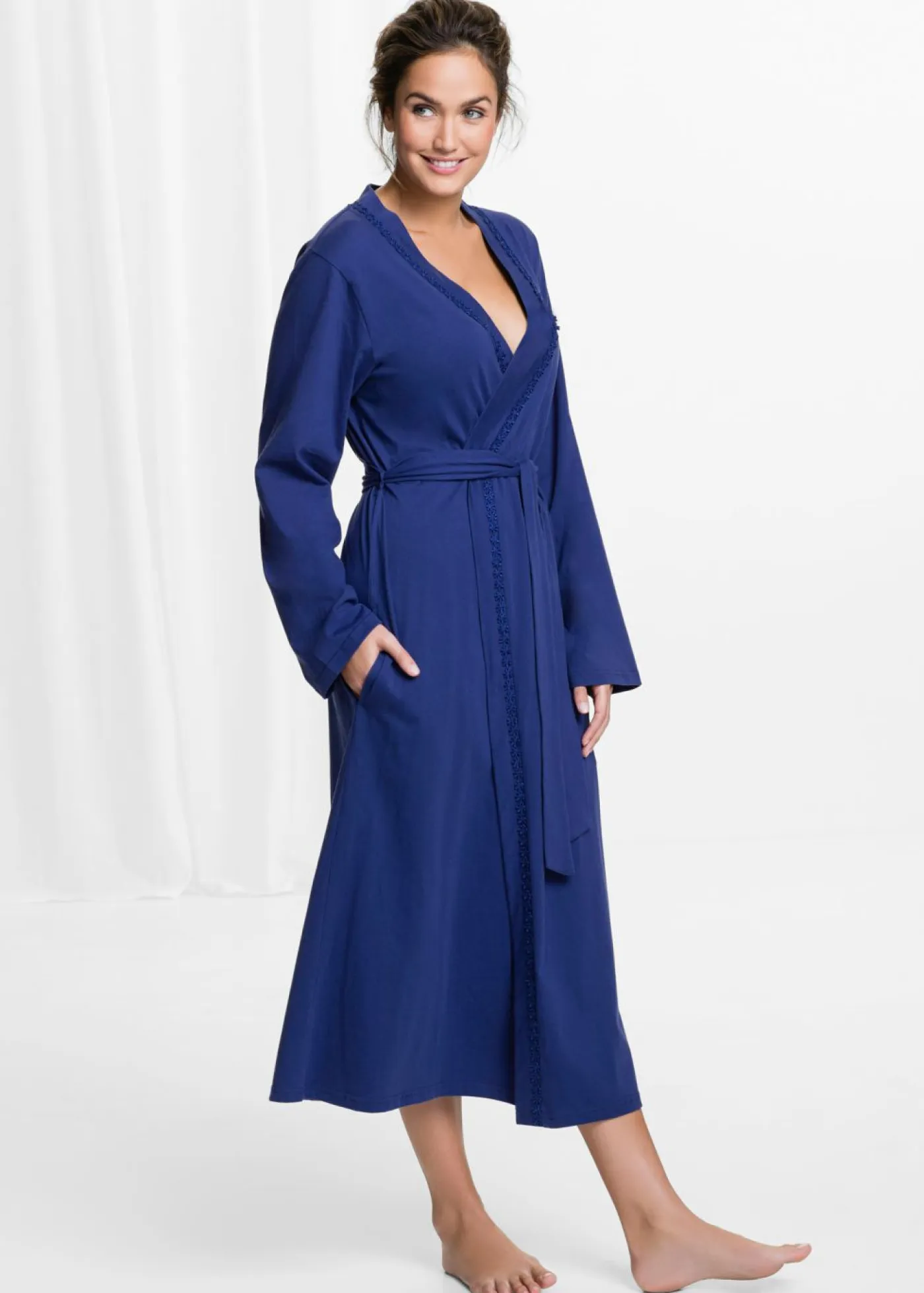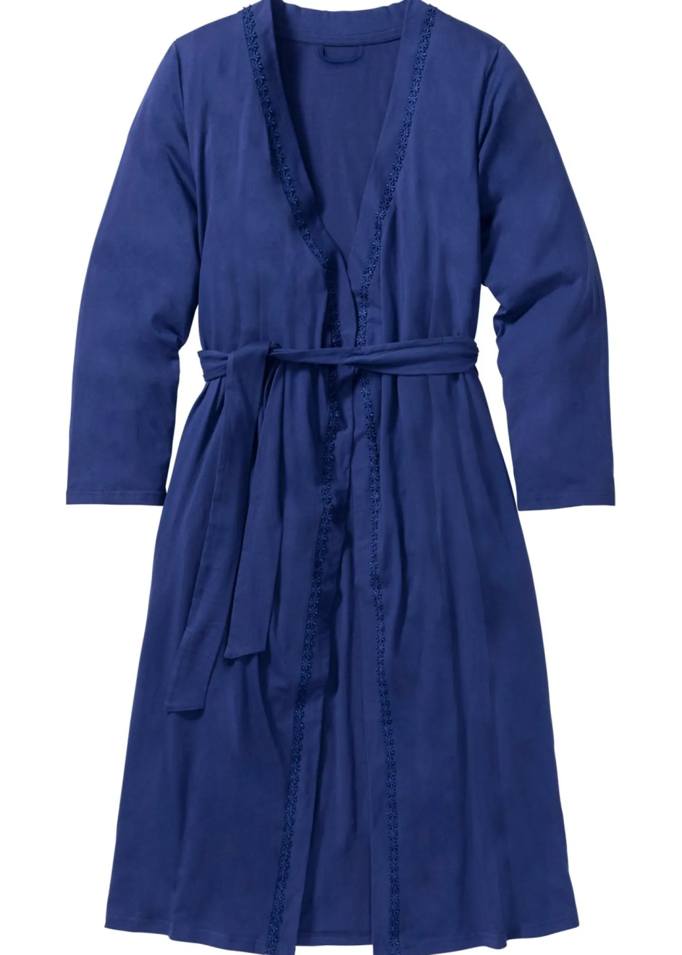 Albornoz suave con borde decorativo. Con cinturón y bolsillos.