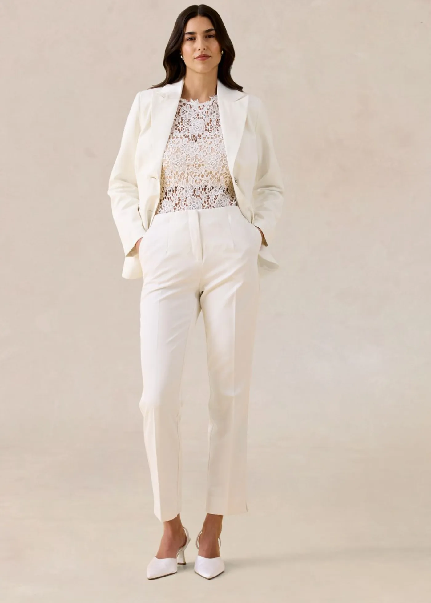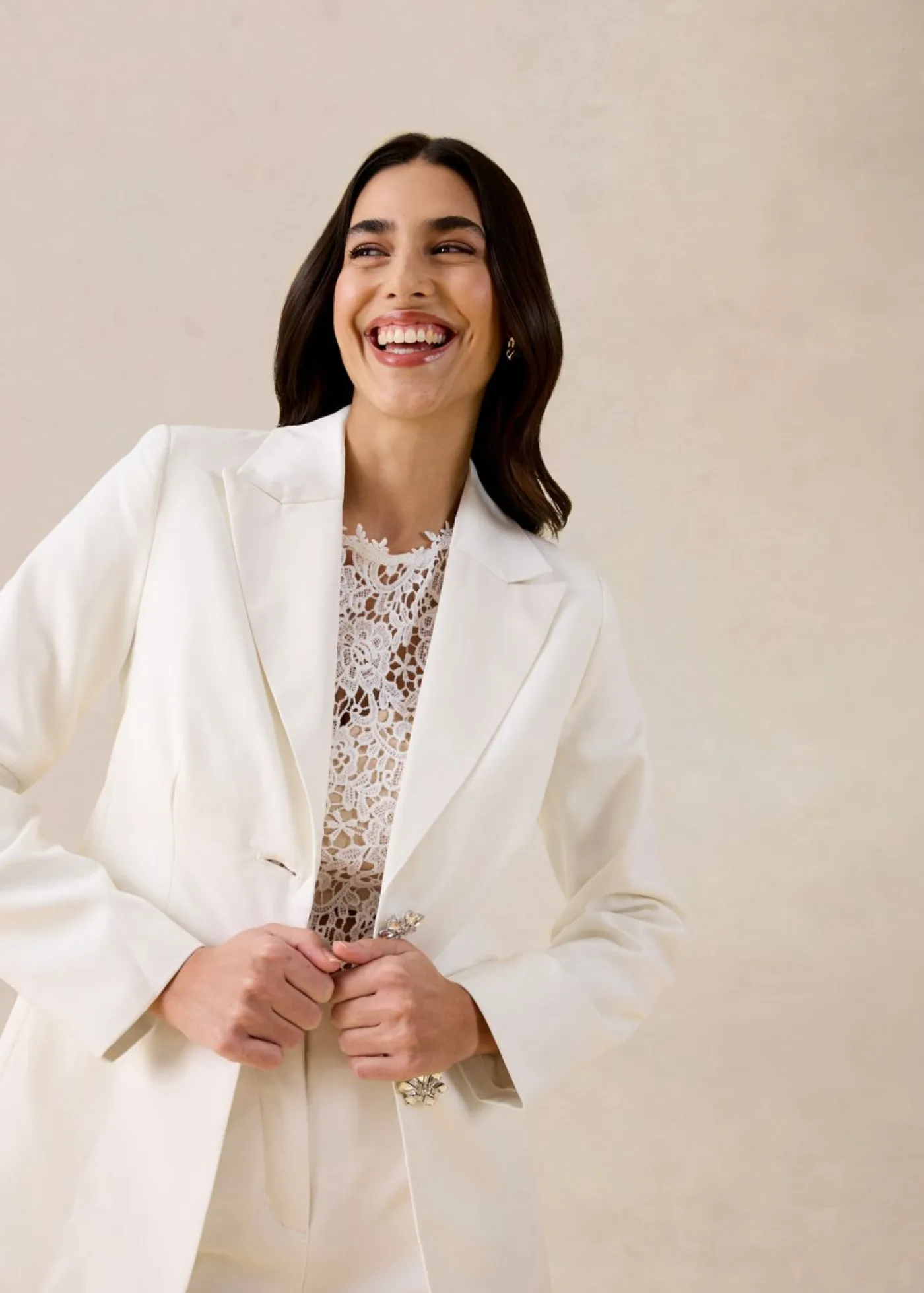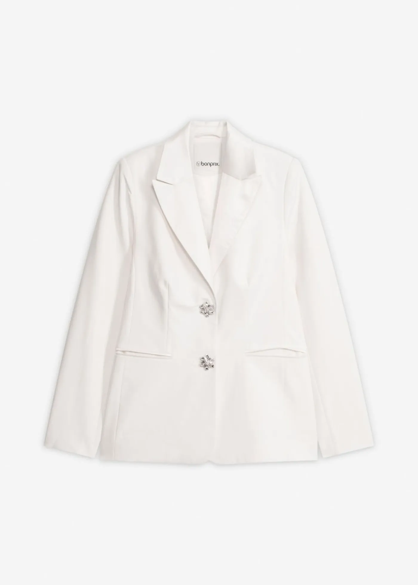 Moderna y femenina: americana con cuello de satén y botones decorativos.