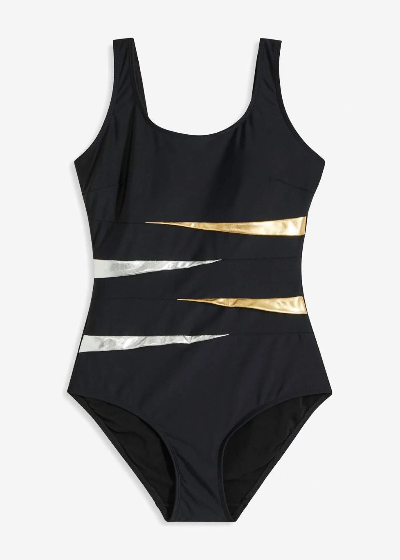 Bañador con gran efecto moldeador. Con inserciones doradas y plateadas en la parte delantera. Hecho con un material moldeador y de gran comodidad. Con copas suaves y forro en la parte del pecho. Goma elástica en la zona bajo el pecho. Con forro moldeador.