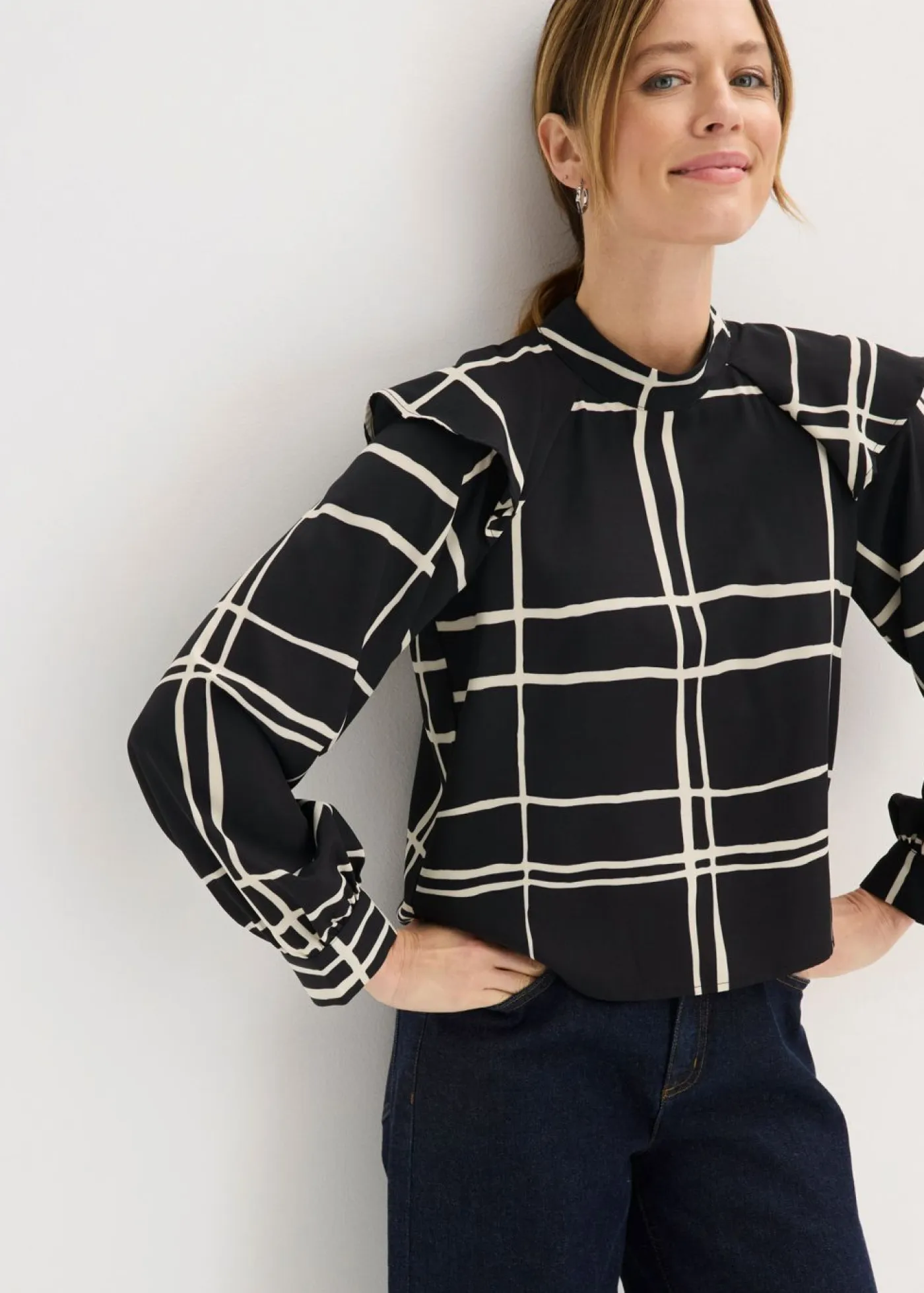 Blusa con estampado moderno, cuello alto y botones en la parte posterior.