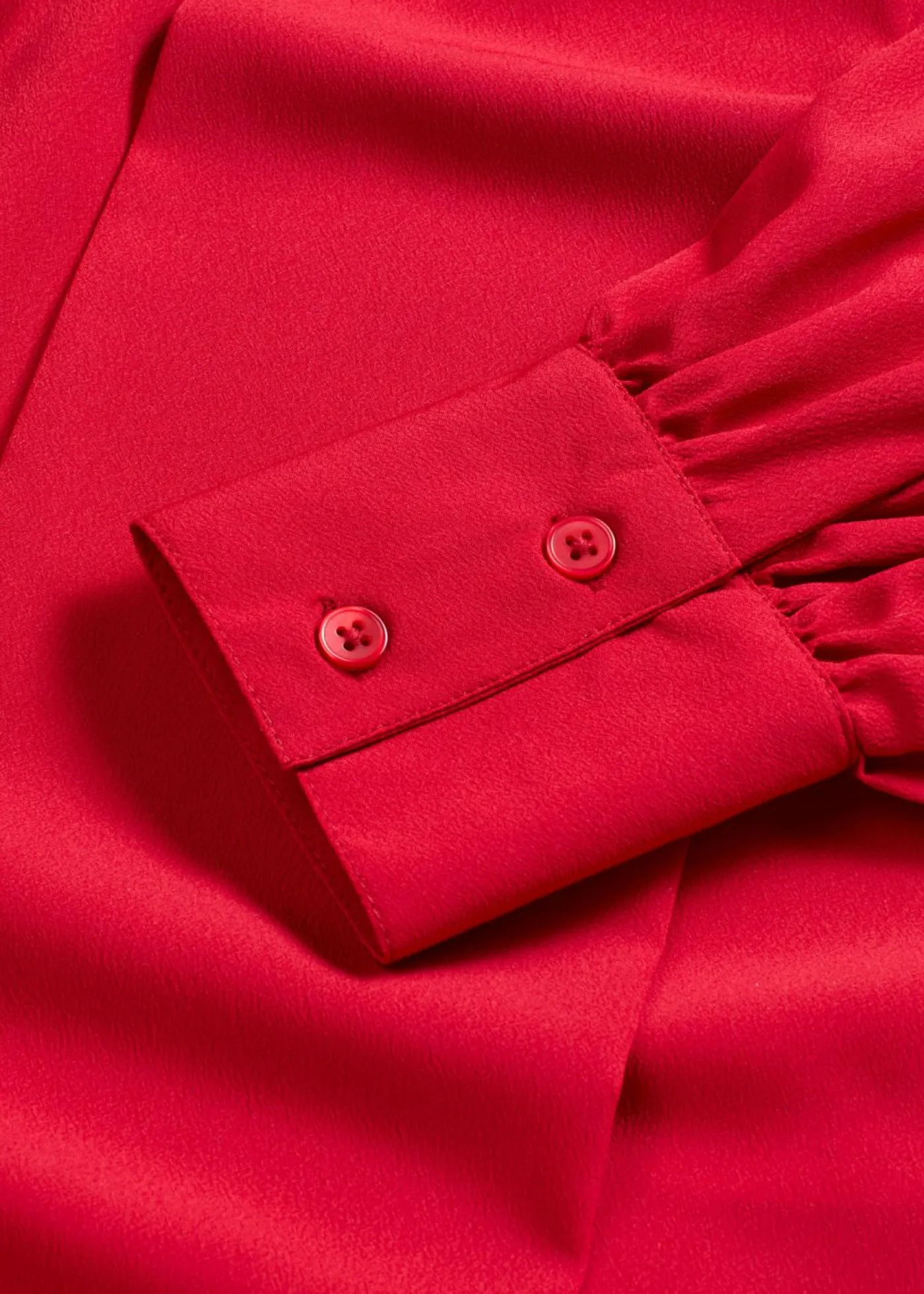 Blusa moderna con lazo en el cuello y botones en la parte delantera.