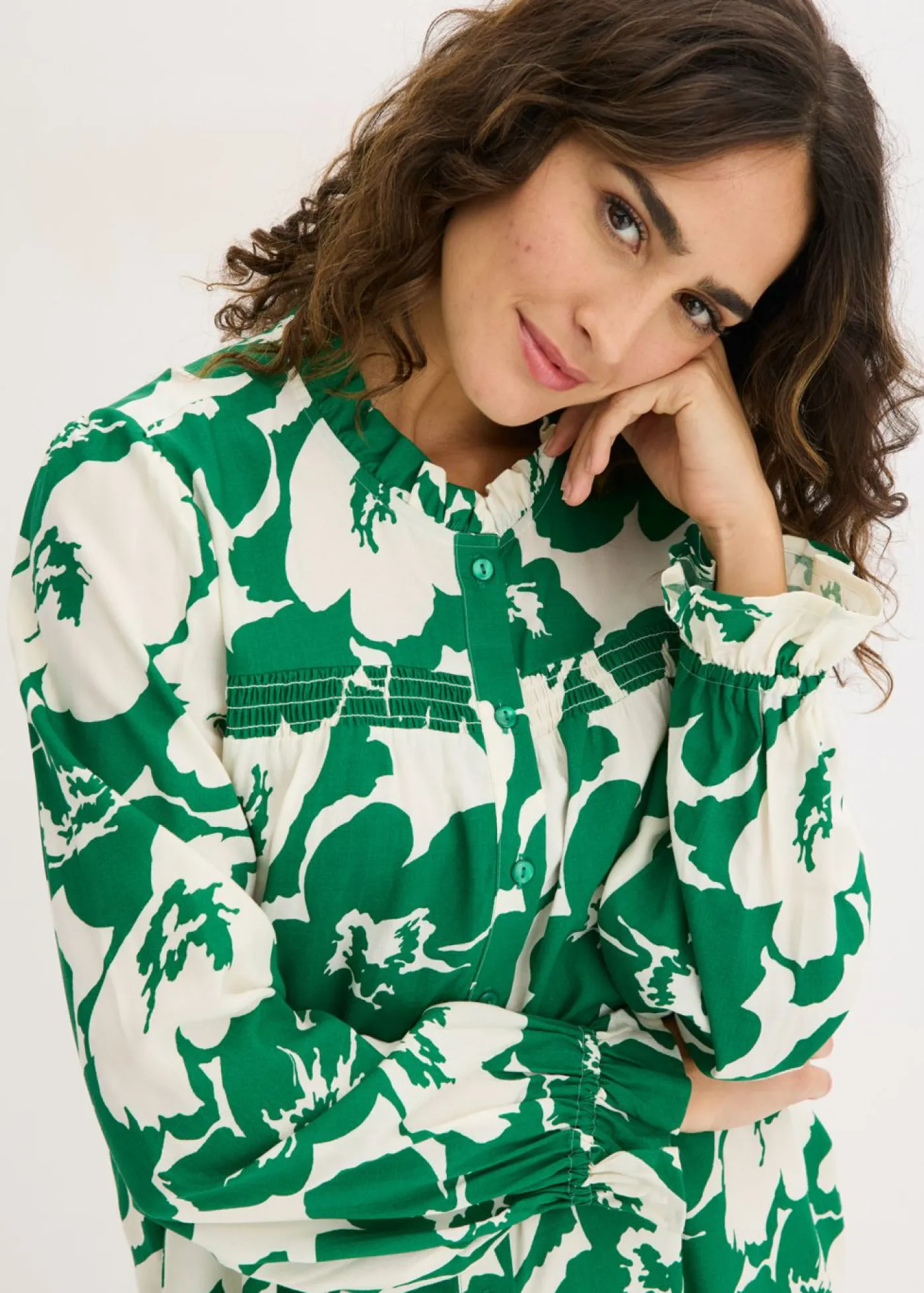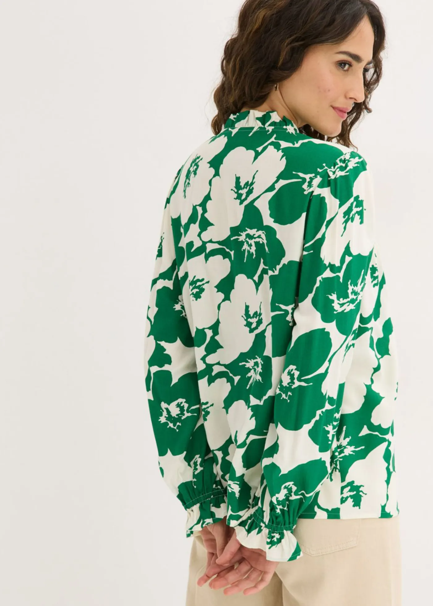 Blusa femenina de viscosa fluida con botones en la parte delantera y pequeño volante en el escote.