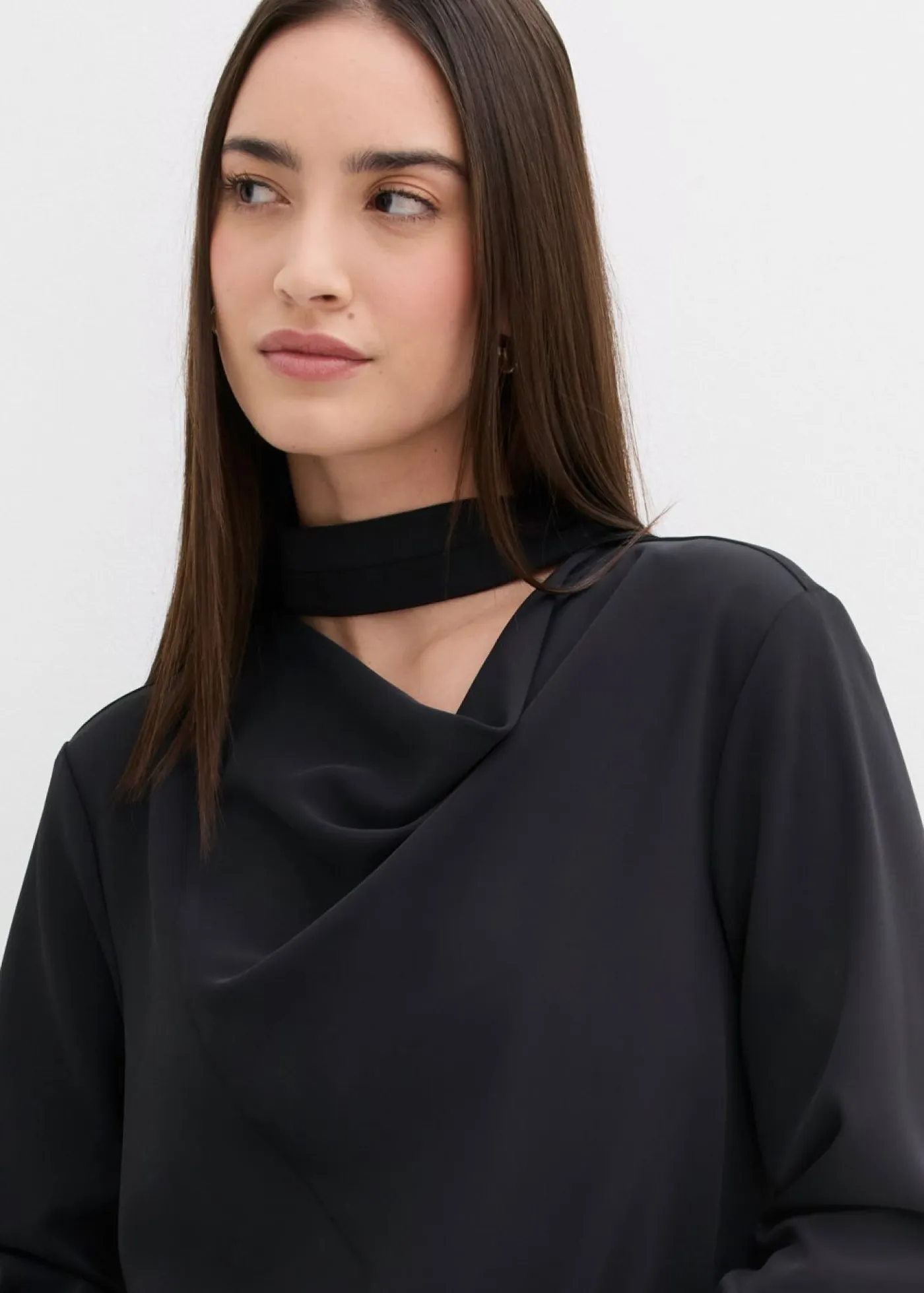 Blusa ligeramente brillante con escote en cascada y detalle ajustable en el cuello.