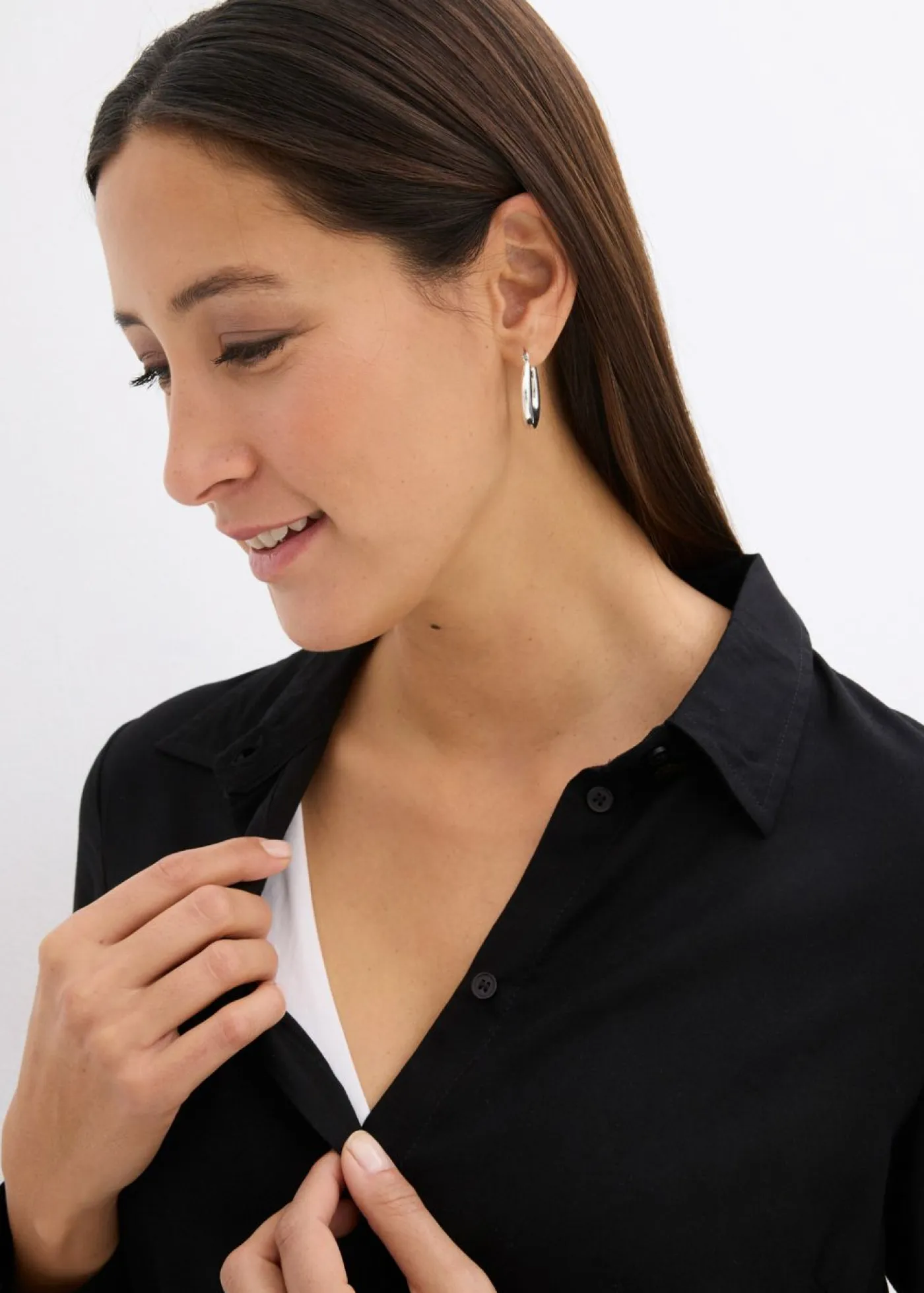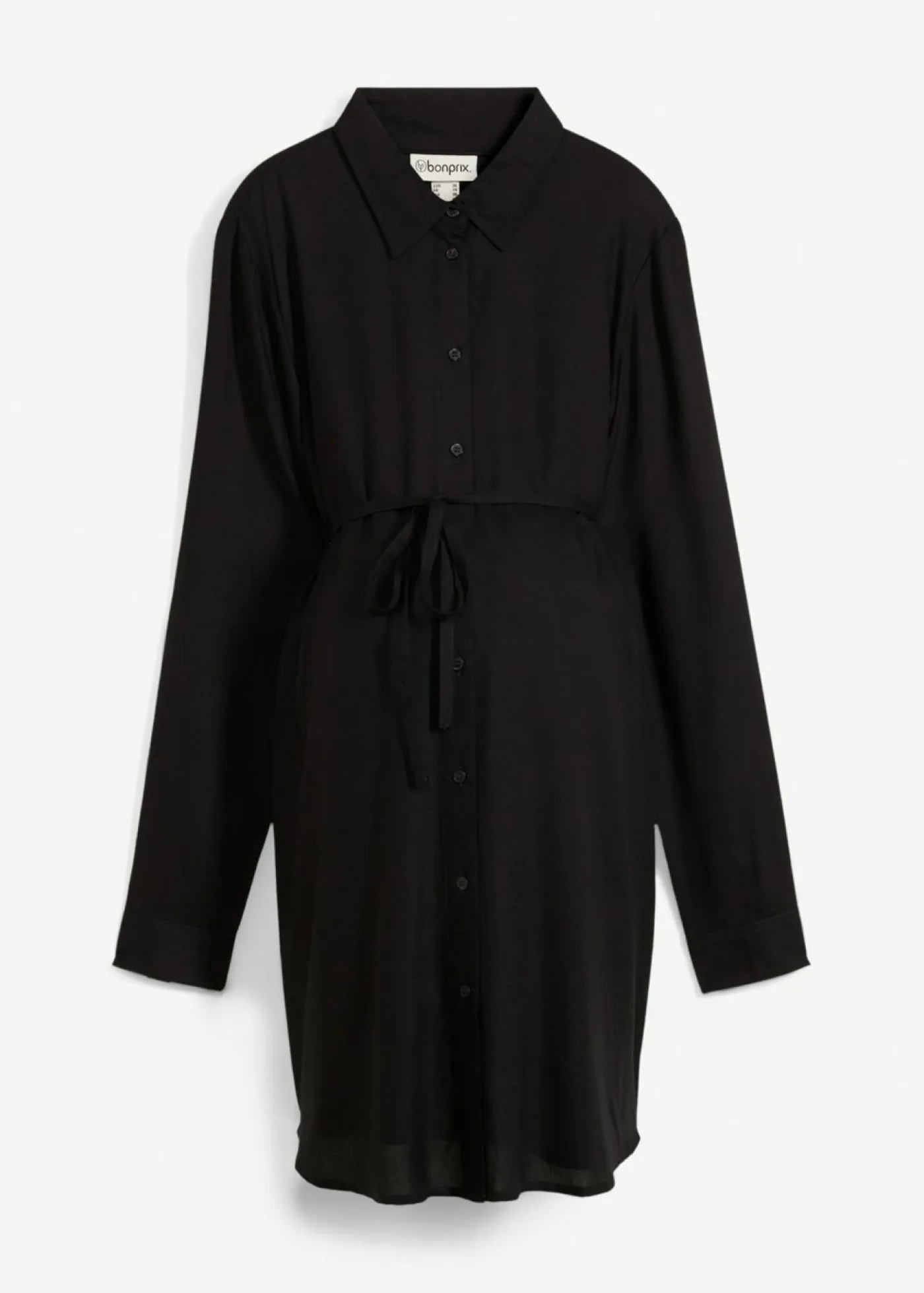 Blusa de manga larga hasta la cadera con cinta. Blusa de manga larga de viscosa hasta la cadera con botones y una cinta desmontable bajo el pecho. Dobladillo ligeramente redondeado.