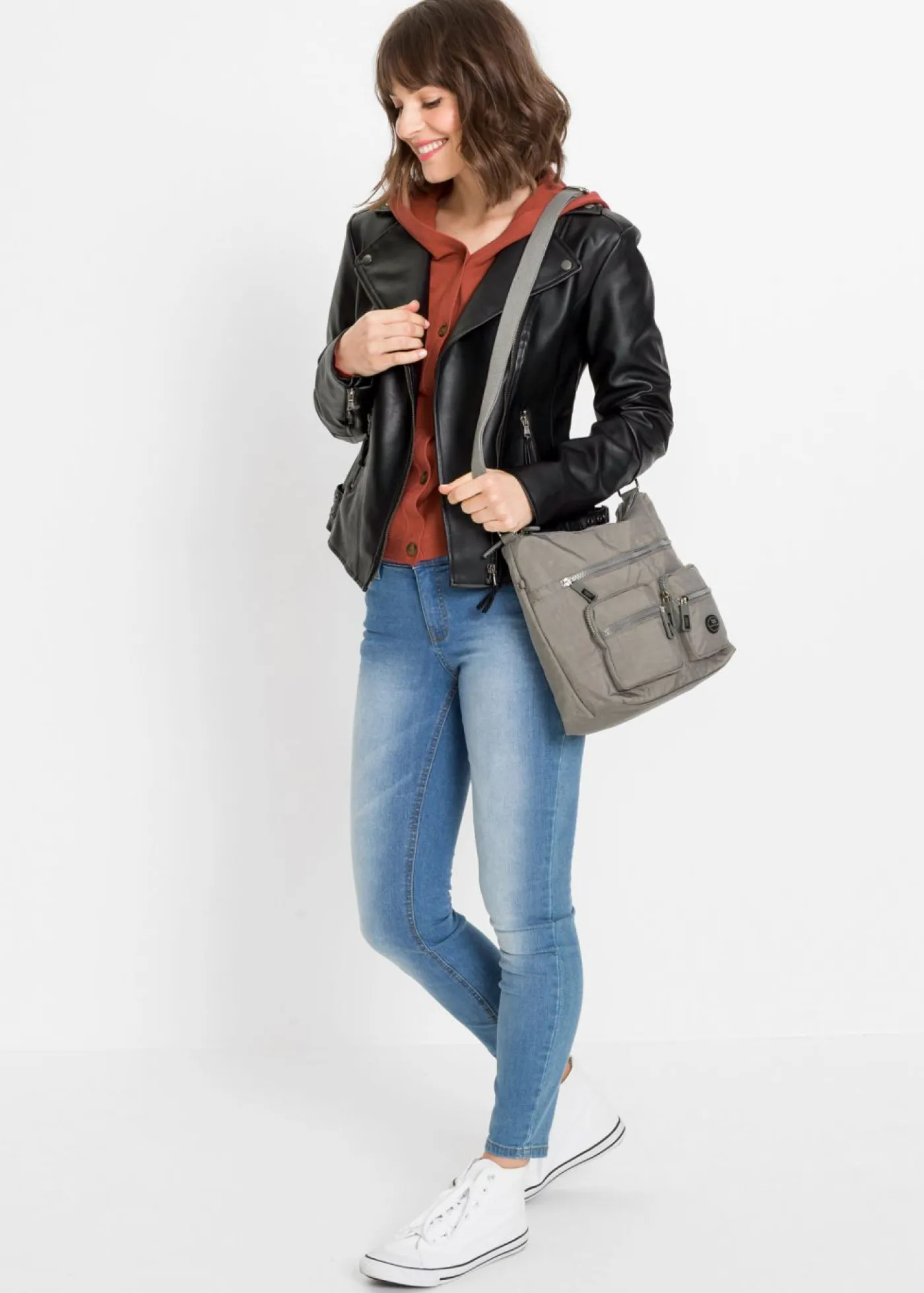 Atractivo bolso bandolera monocolor. Práctico bolso bandolera con dos compartimentos principales y cinco bolsillos frontales adicionales con cremallera. El ancho superior es de aprox. 30 cm.