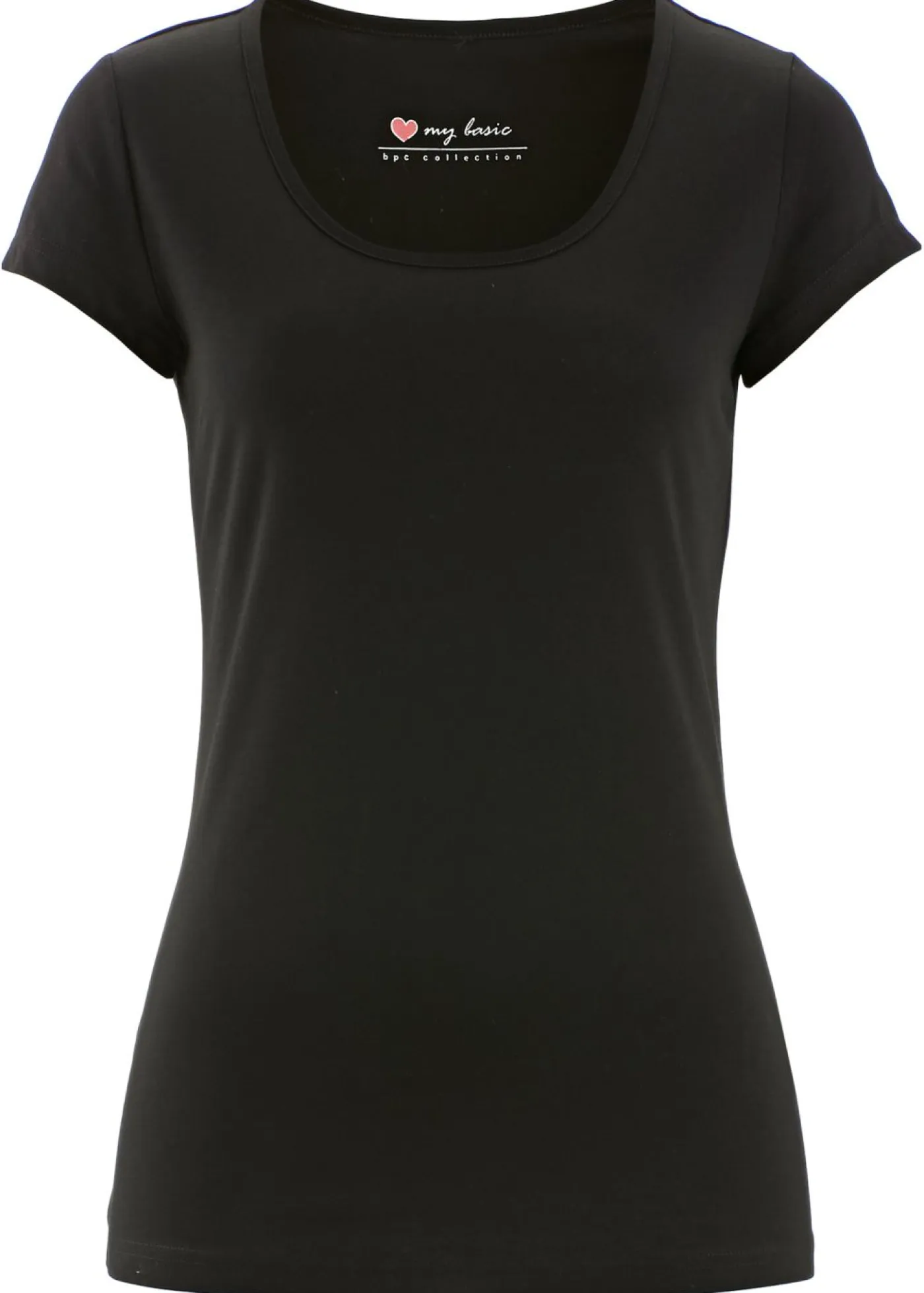 Camiseta de algodón con manga corta. Camiseta de b.p.c. Casual en bonito tejido elástico con cuello redondo. Largo de aprox. 62 cm (talla 32/34) a aprox. 70 cm (talla 48/50). Se puede lavar a máquina.