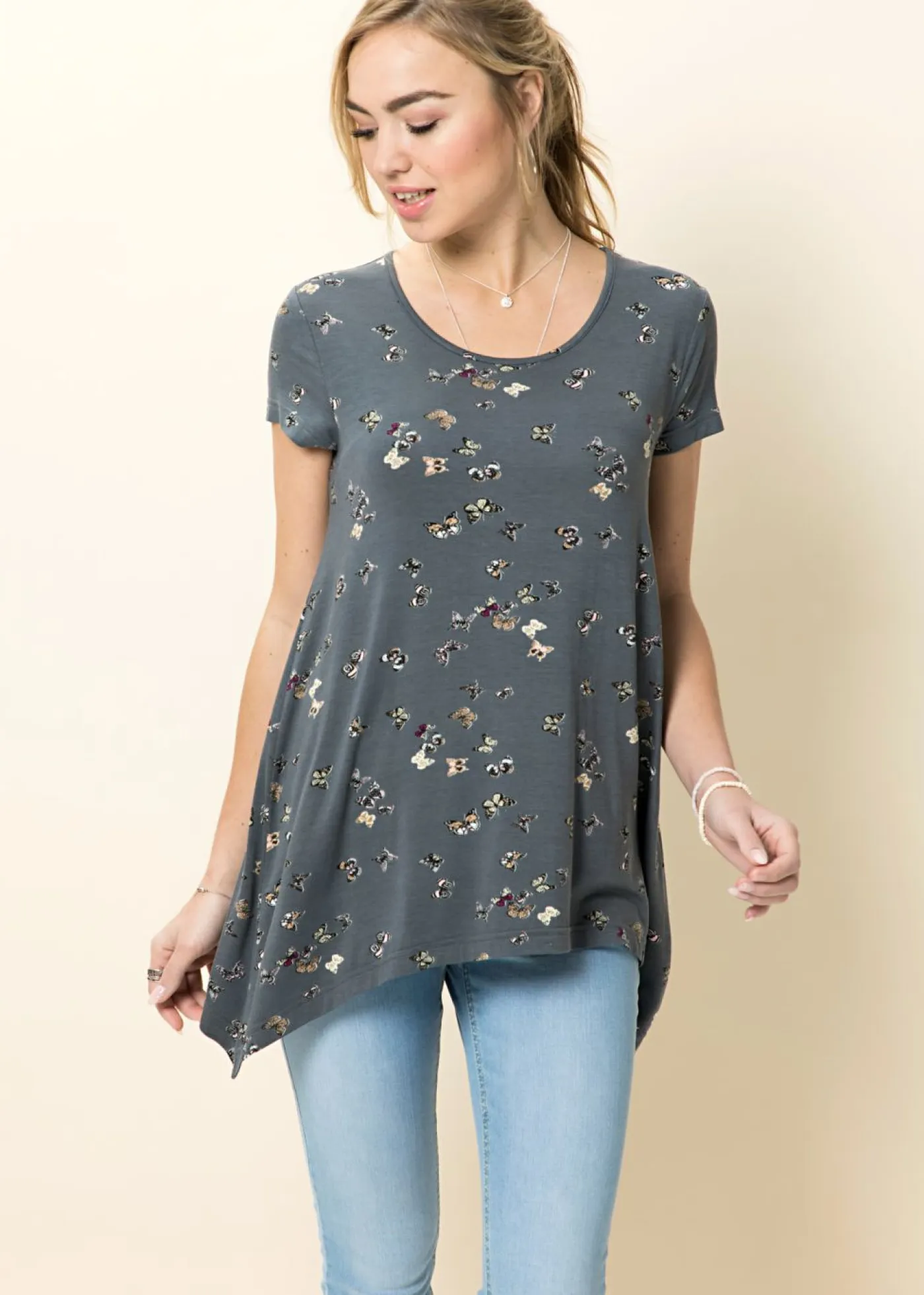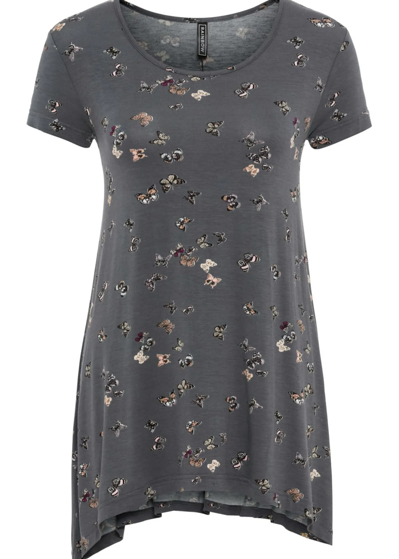 Camisa dulce de manga corta con dobladillo puntiagudo. Ligeramente acampanada con los laterales más largos. Largo de aprox. 70 cm en talle 40/42.