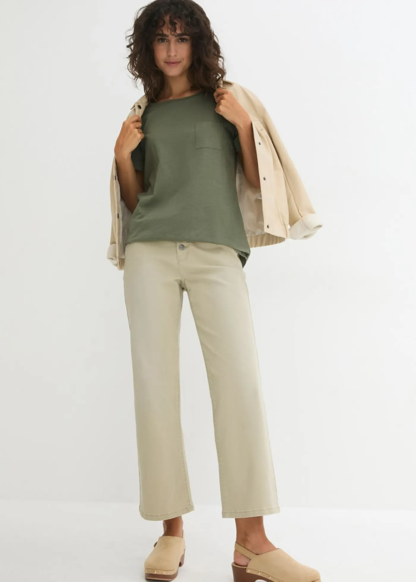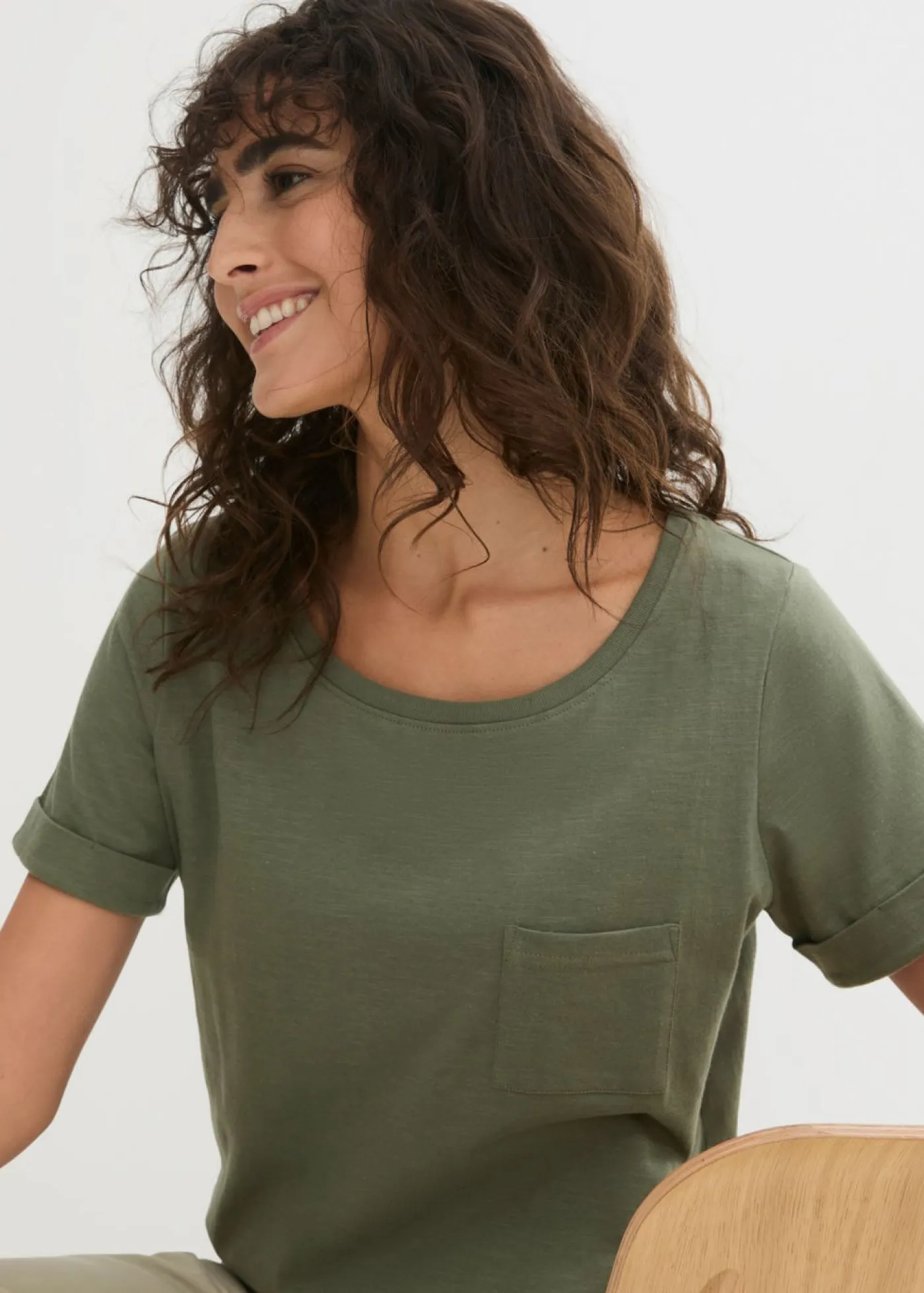 Camiseta de hilo flameado de algodón orgánico con bolsillo decorativo en el pecho. Largo de aprox. 68 cm (talla 36/38) a aprox. 78 cm (talla 56/58). Se puede lavar a máquina.