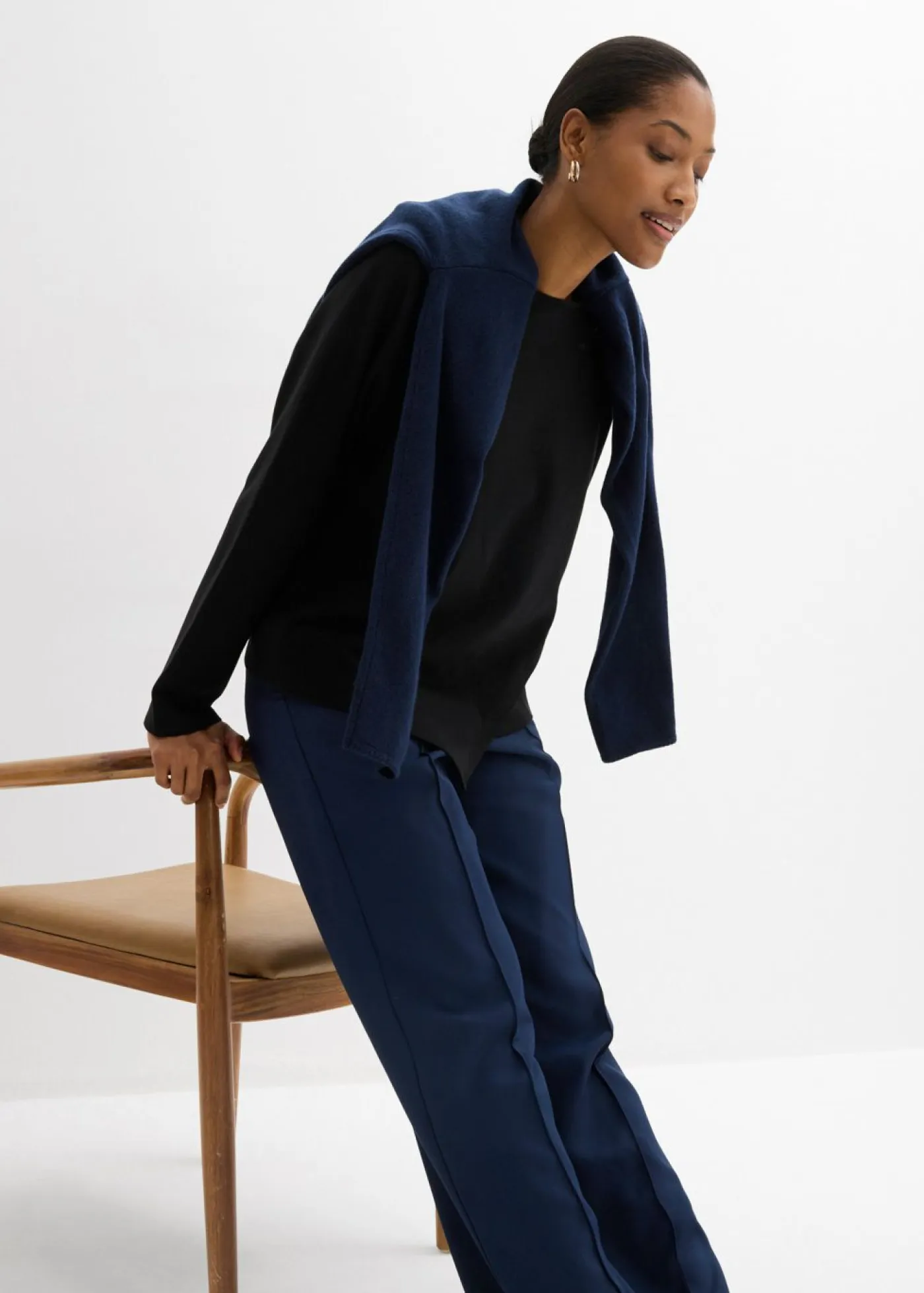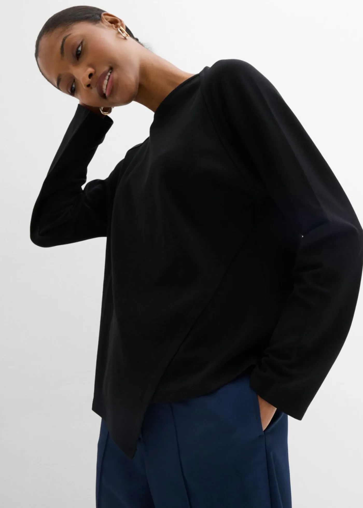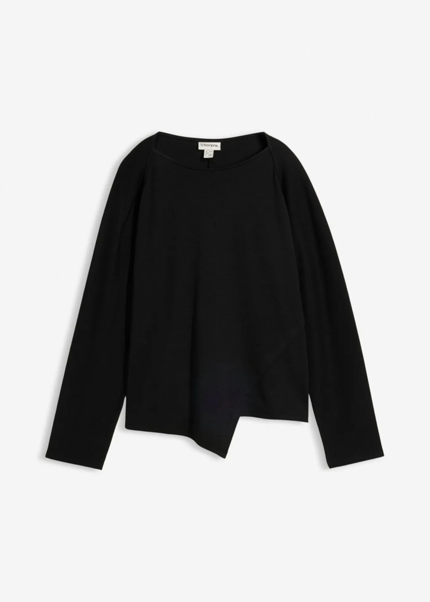 Camiseta de manga larga con cuello en cascada y dobladillo asimétrico.