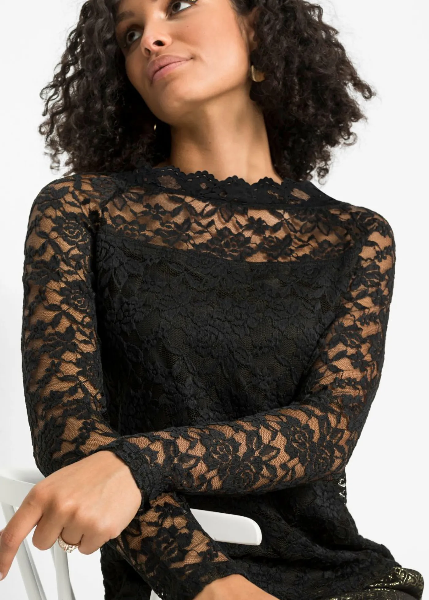 Maravillosa camiseta de encaje. Con escote ancho y bajo recto. Largo óptico de aprox. 60 cm en talla 38.