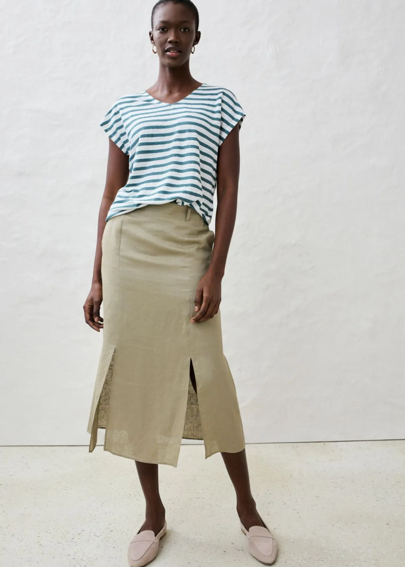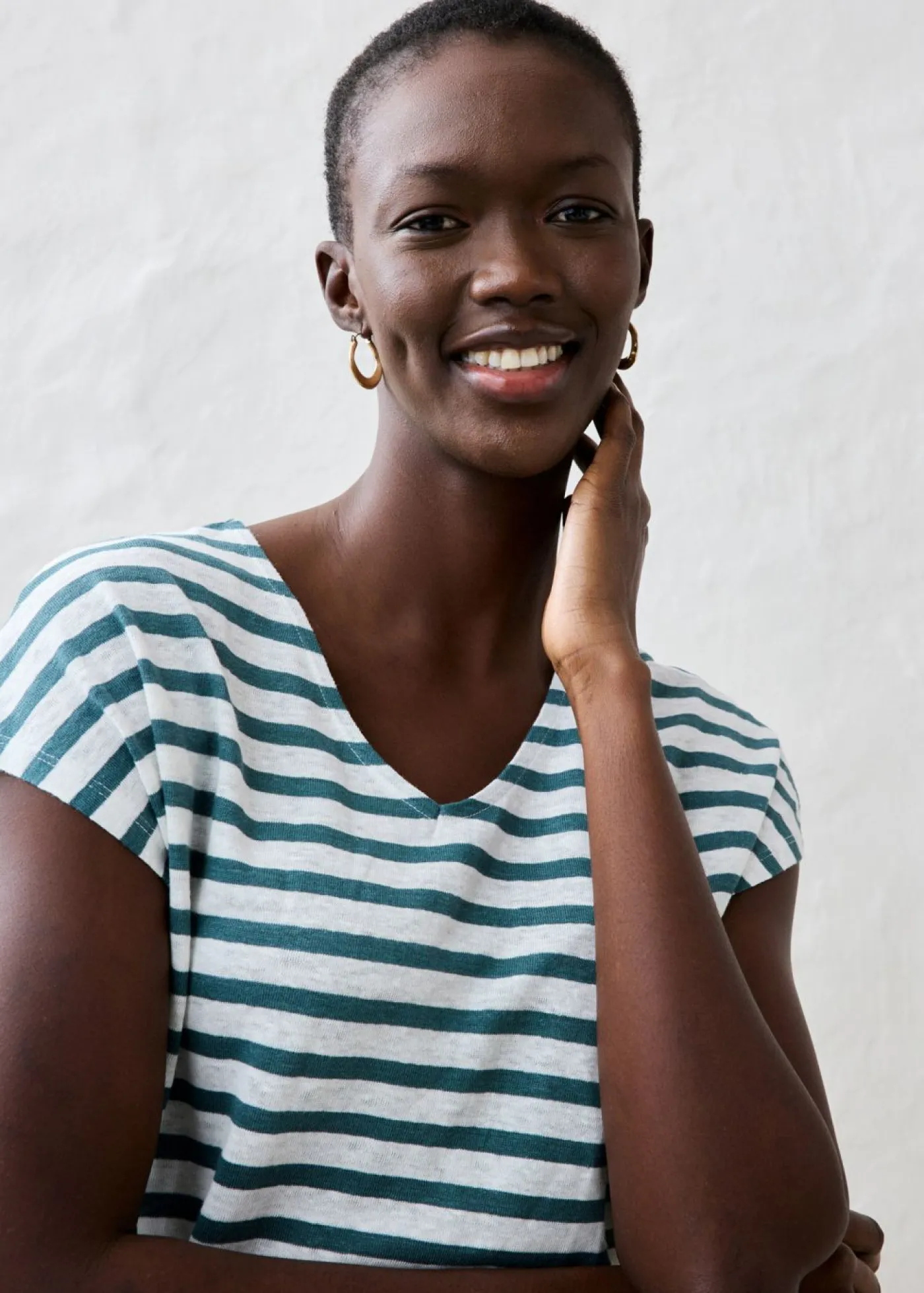 Camiseta de lino con diseño de rayas y escote en V en la parte delantera y trasera. El lino es una fibra natural resistente y, gracias a sus propiedades fibrosas, transpira la piel. Se caracteriza por los finos pliegues y la superficie estructurada. Agradable y vaporoso, el lino será tu compañero ideal para el verano.