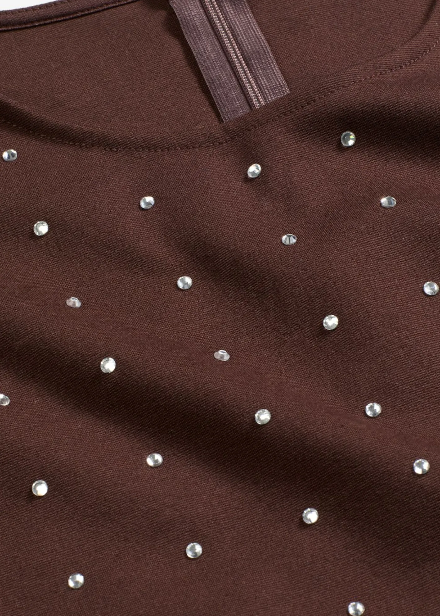 Moderna camiseta de manga larga confeccionada en punto de Roma con aplicaciones de pedrería y cremallera en la espalda.
