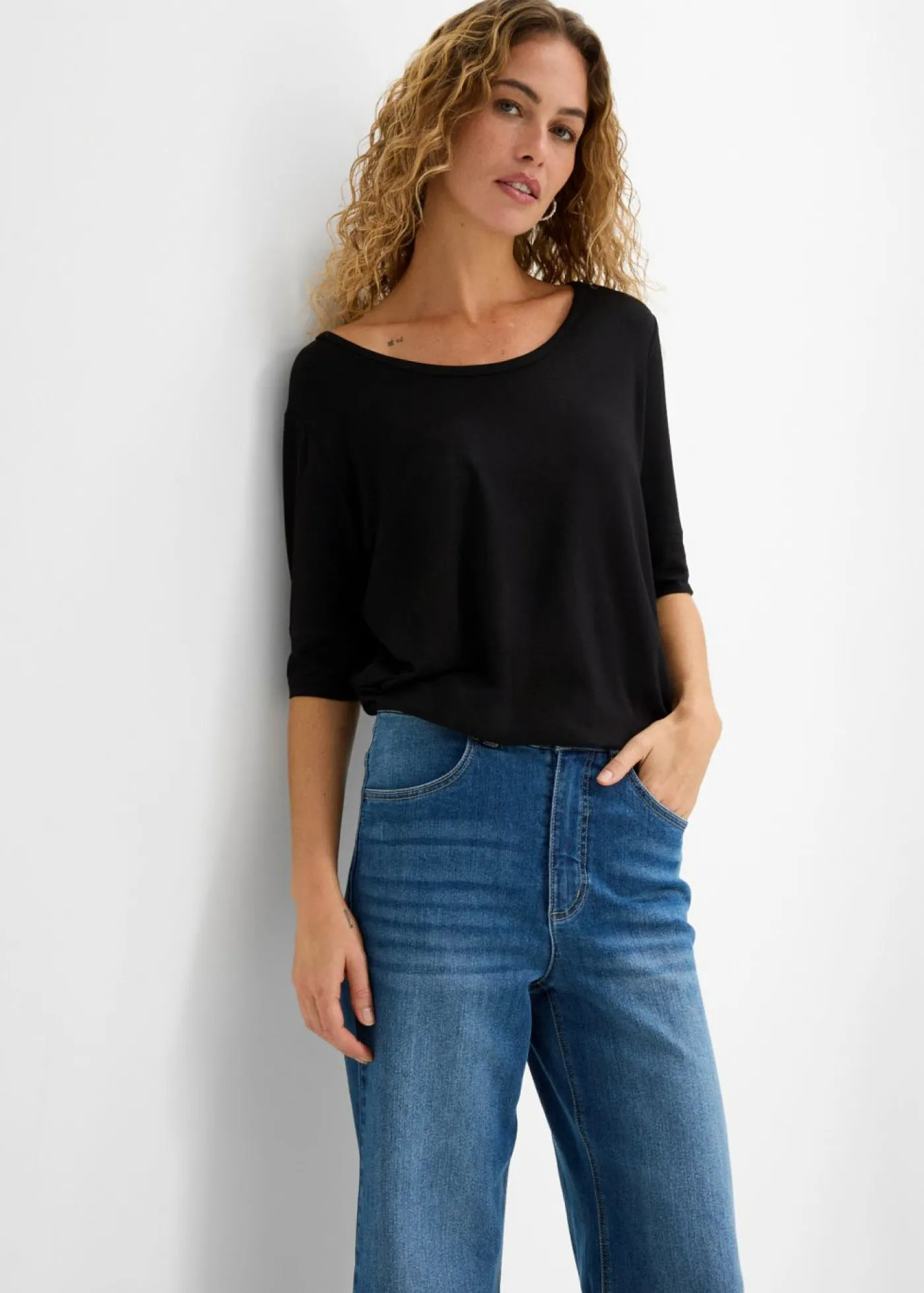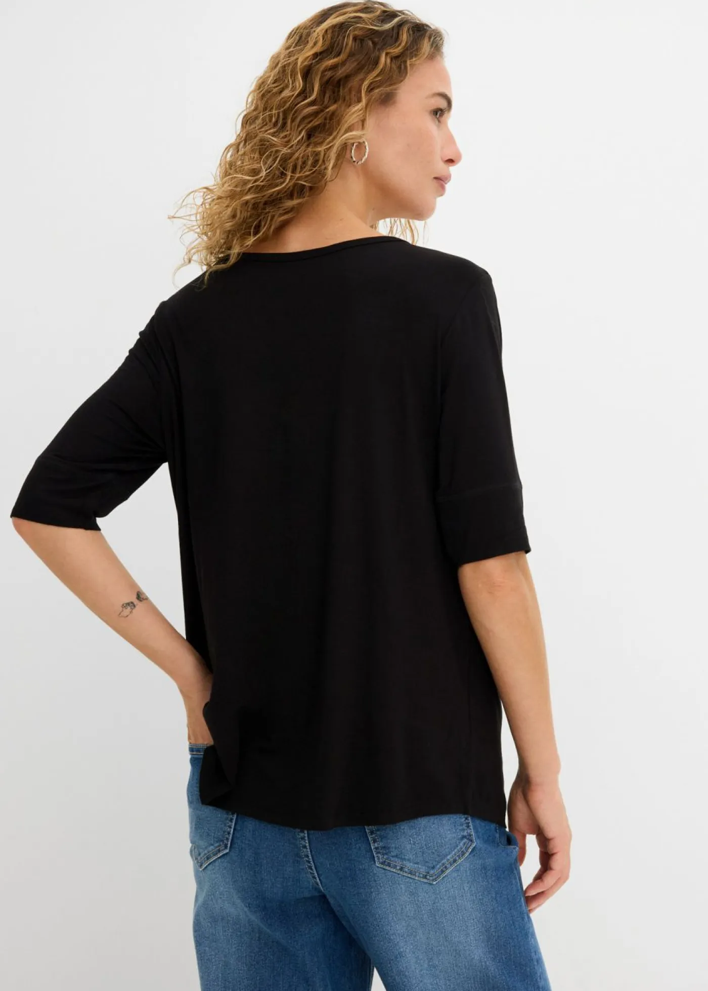 Camiseta versátil en tejido de punto suave. Favorecedora camiseta con dobladillo redondeado. Cómodo tejido de punto y costuras en contraste en las mangas. Largo de aprox. 68 cm en talla 36/38.