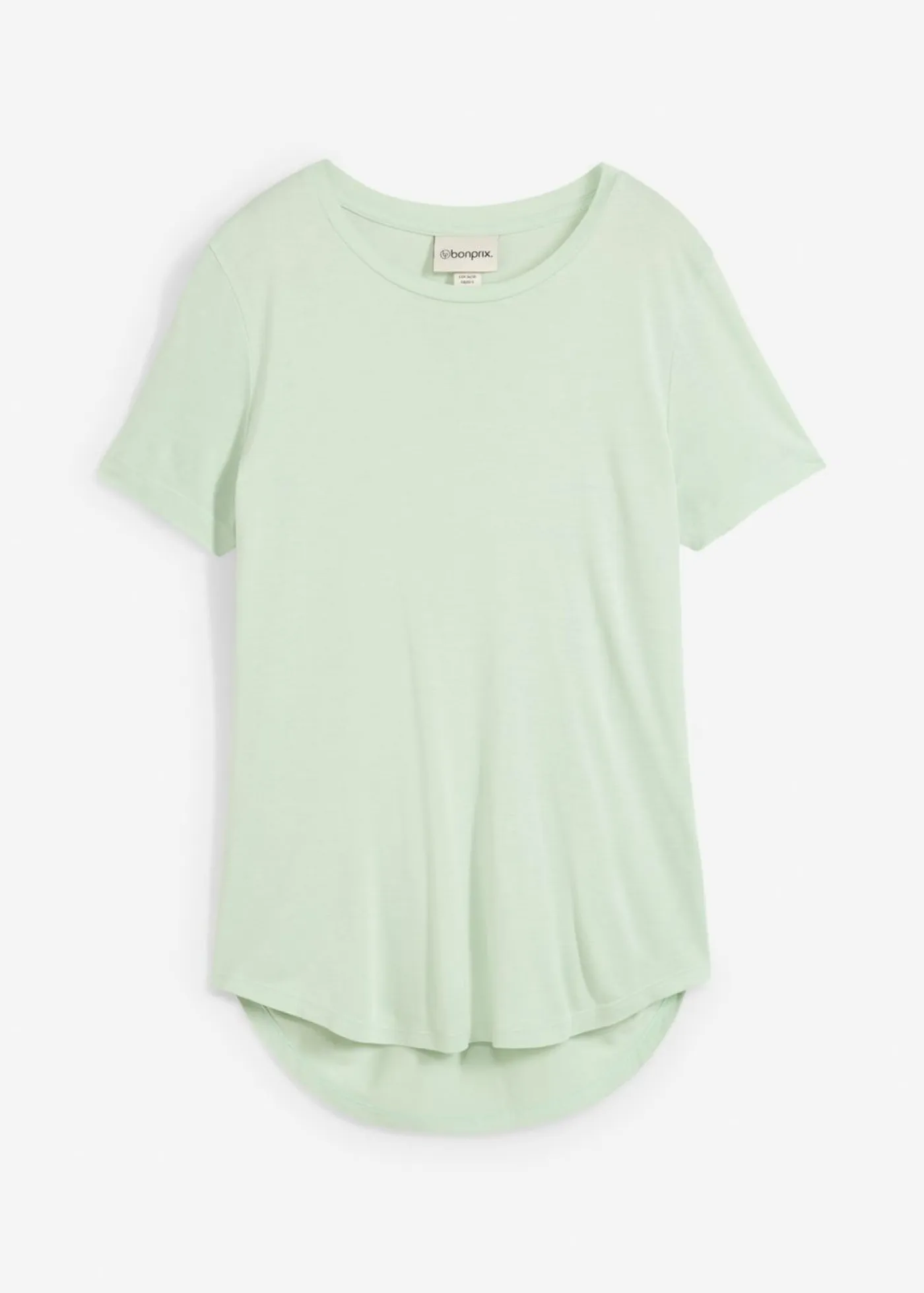 Moderna camiseta larga, con dobladillo redondeado y cuello redondo.