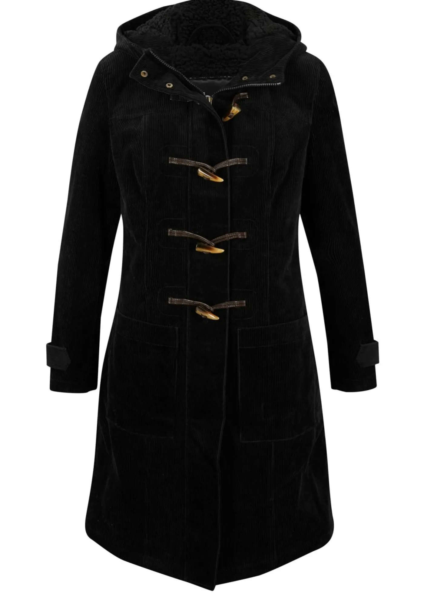 Capa forrado de pana con capucha y botones tipo trenca. Largo de aprox. 96 cm en todas las tallas. Se puede lavar a máquina.