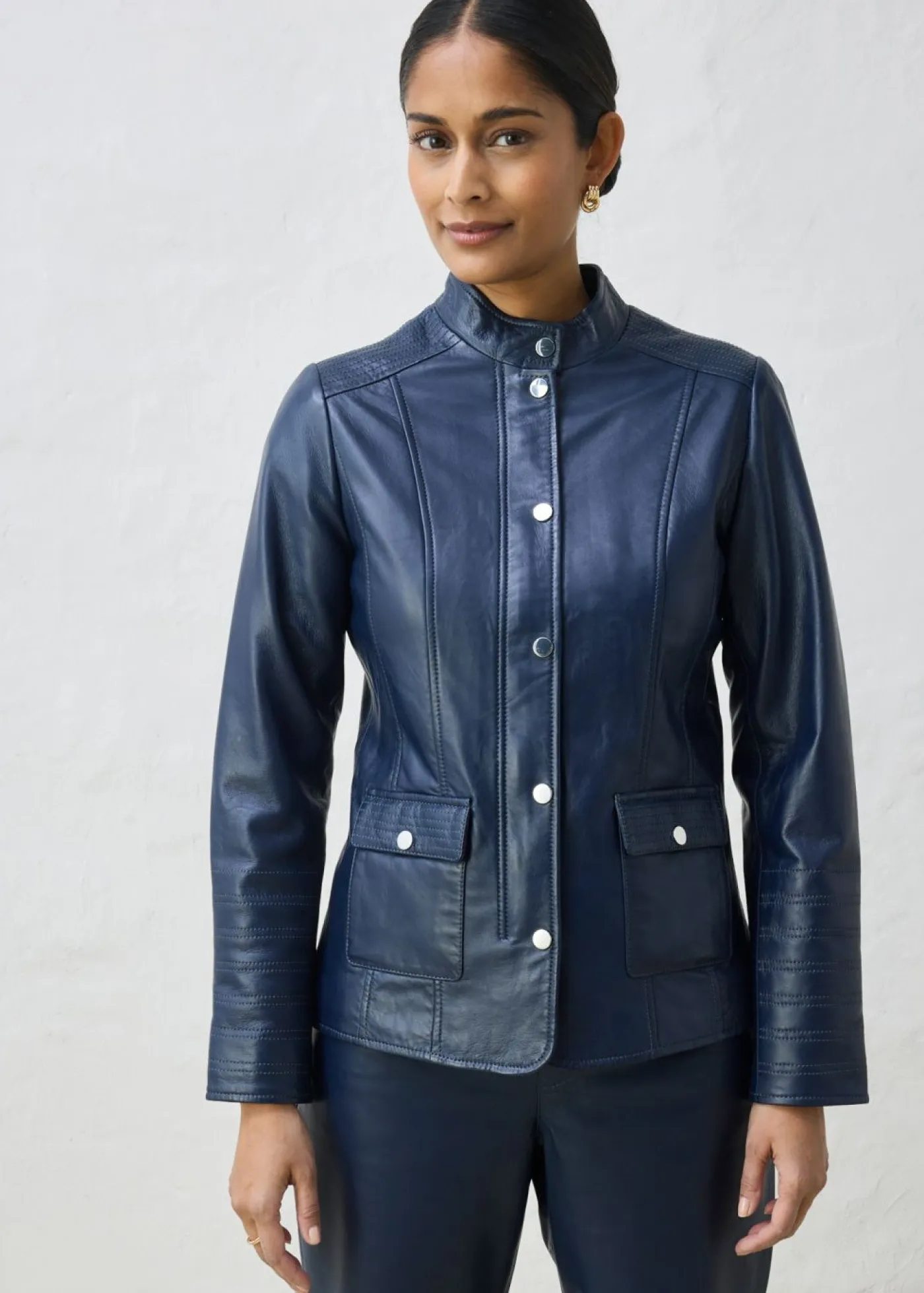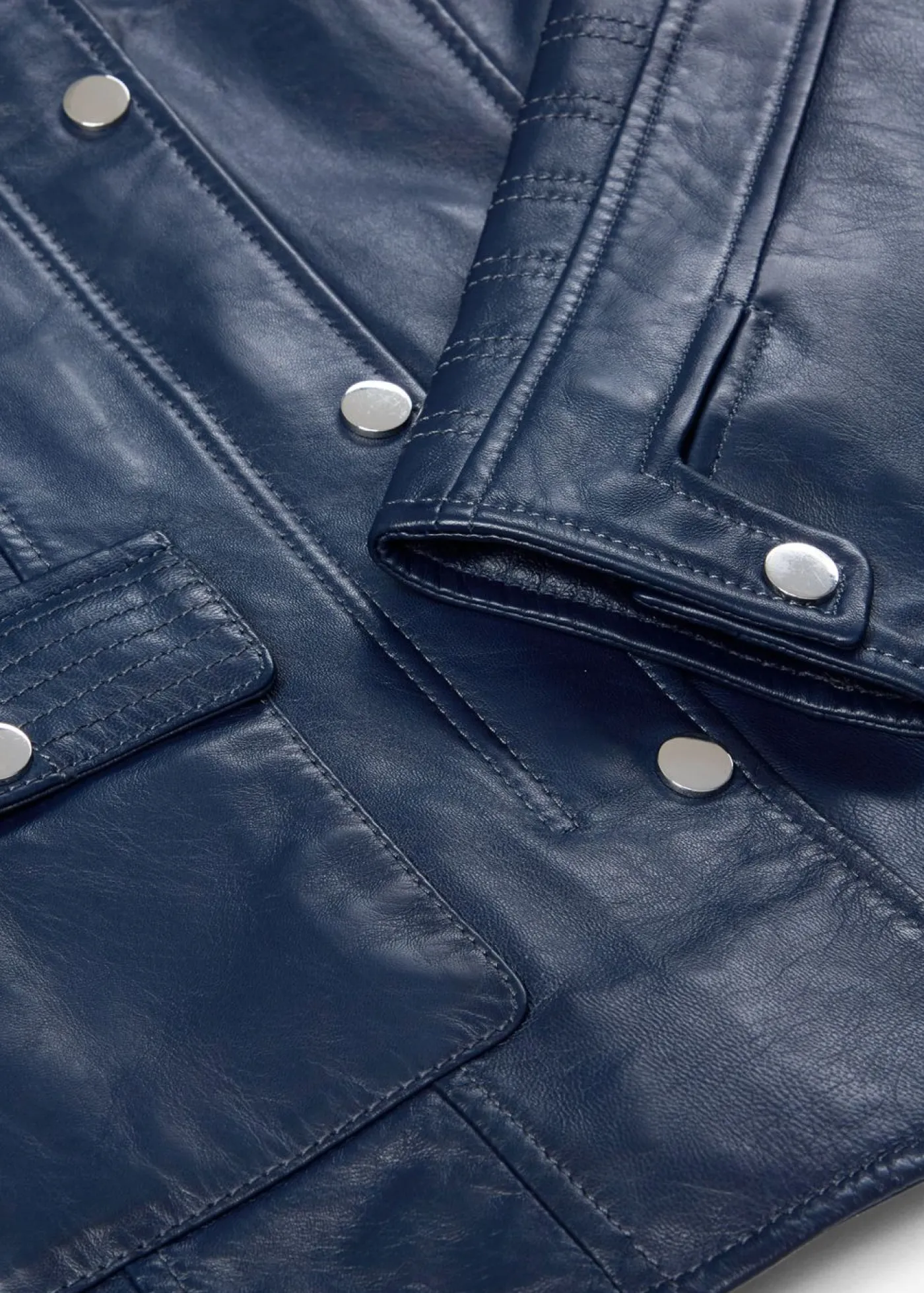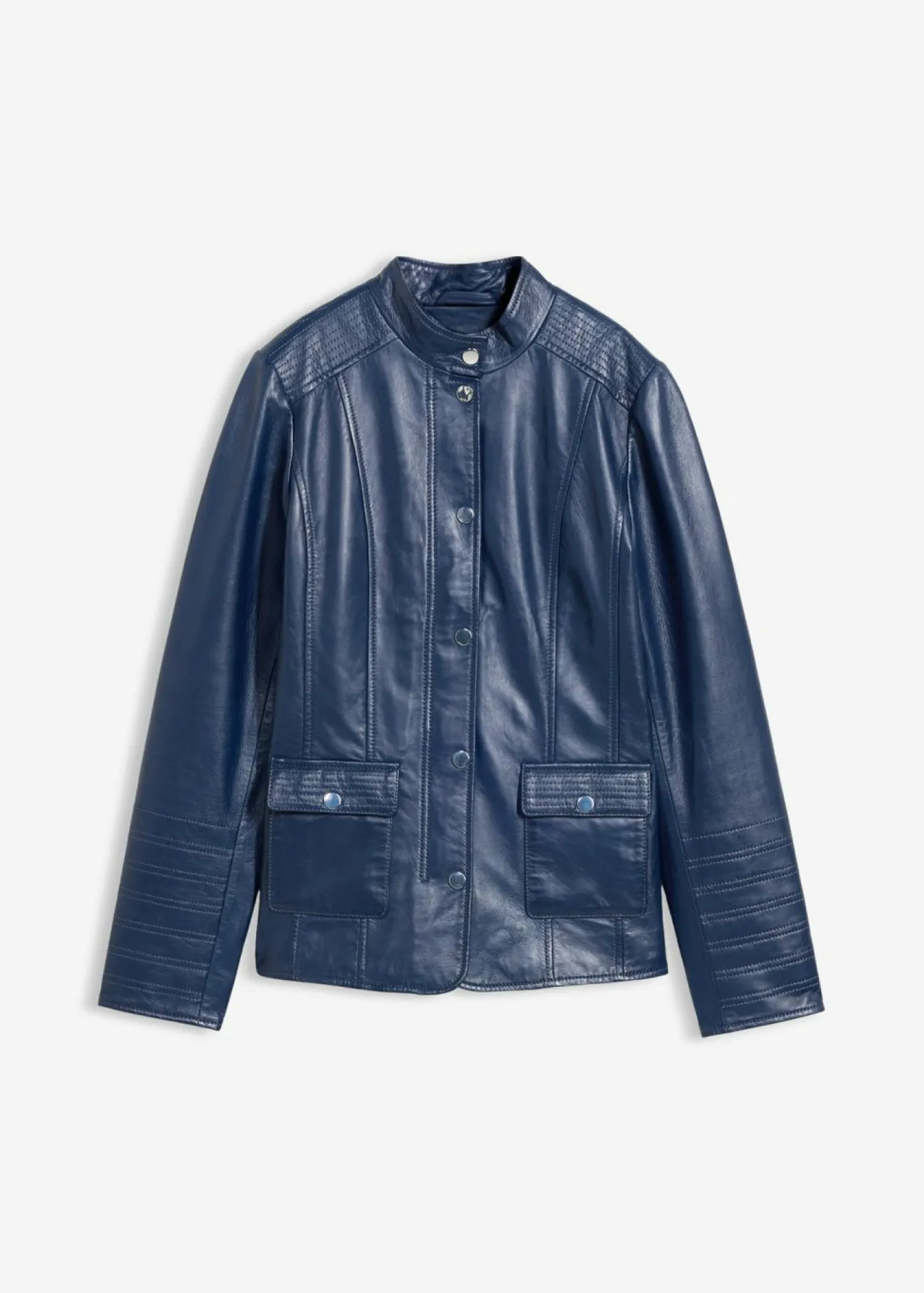 Chaqueta de cuero clásica con cuello alto y detalles elaborados. El borrego es un cuero noble y de calidad que sorprende por su suavidad y durabilidad. Las irregularidades naturales le dan carácter al cuero de alta calidad y hacen que cada artículo sea único. Nuestra fina napa de cordero tiene un curtido vegetal.