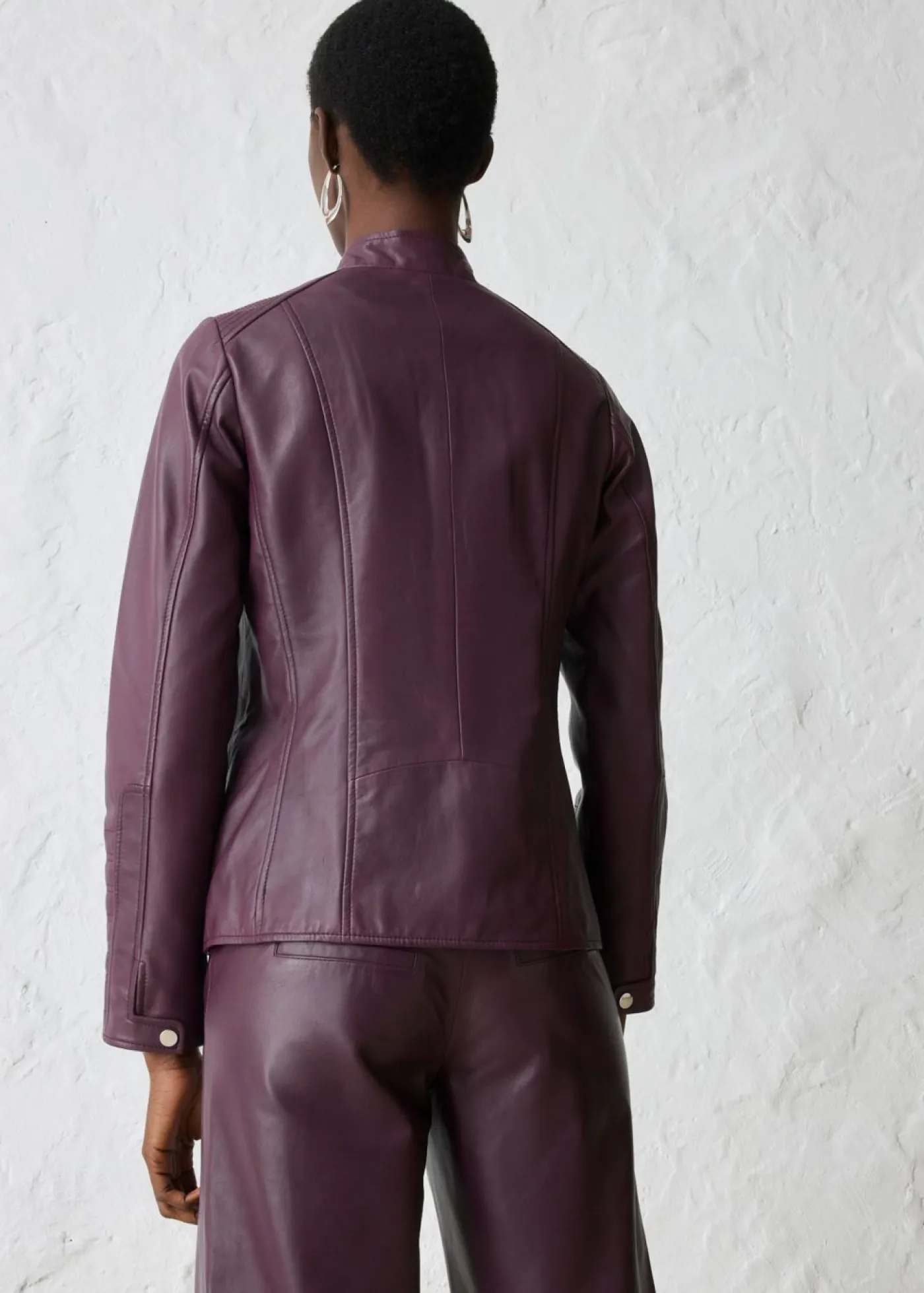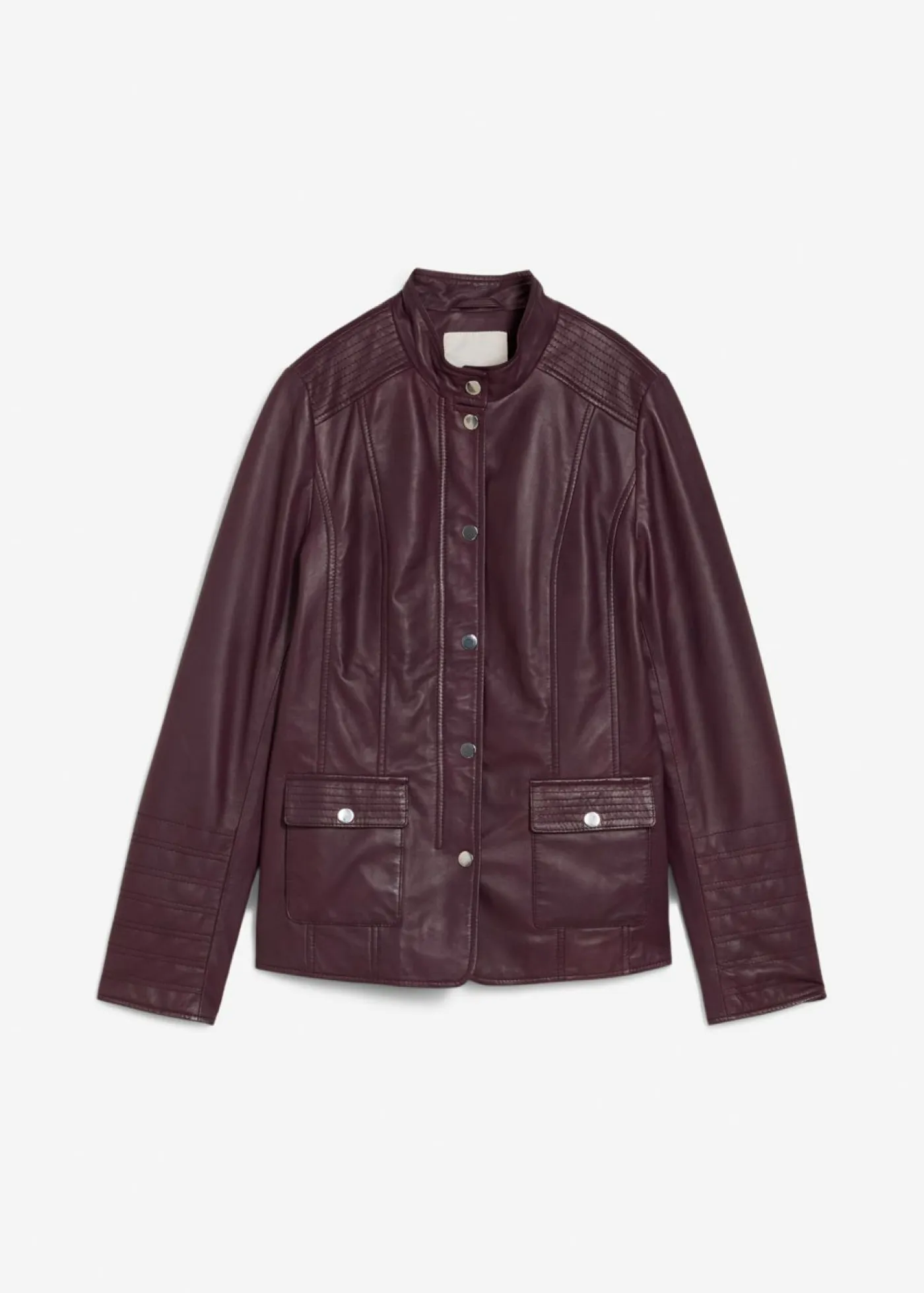 Chaqueta de cuero clásica con cuello alto y detalles elaborados. El borrego es un cuero noble y de calidad que sorprende por su suavidad y durabilidad. Las irregularidades naturales le dan carácter al cuero de alta calidad y hacen que cada artículo sea único. Nuestra fina napa de cordero tiene un curtido vegetal.