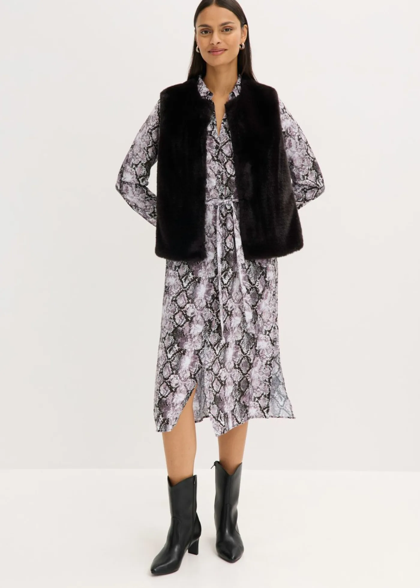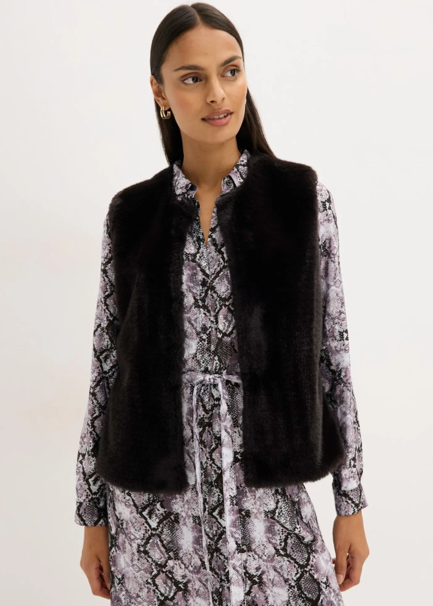 Moderno chaleco de pelo sintético con cierre de ganchos y ojales en la parte delantera.
