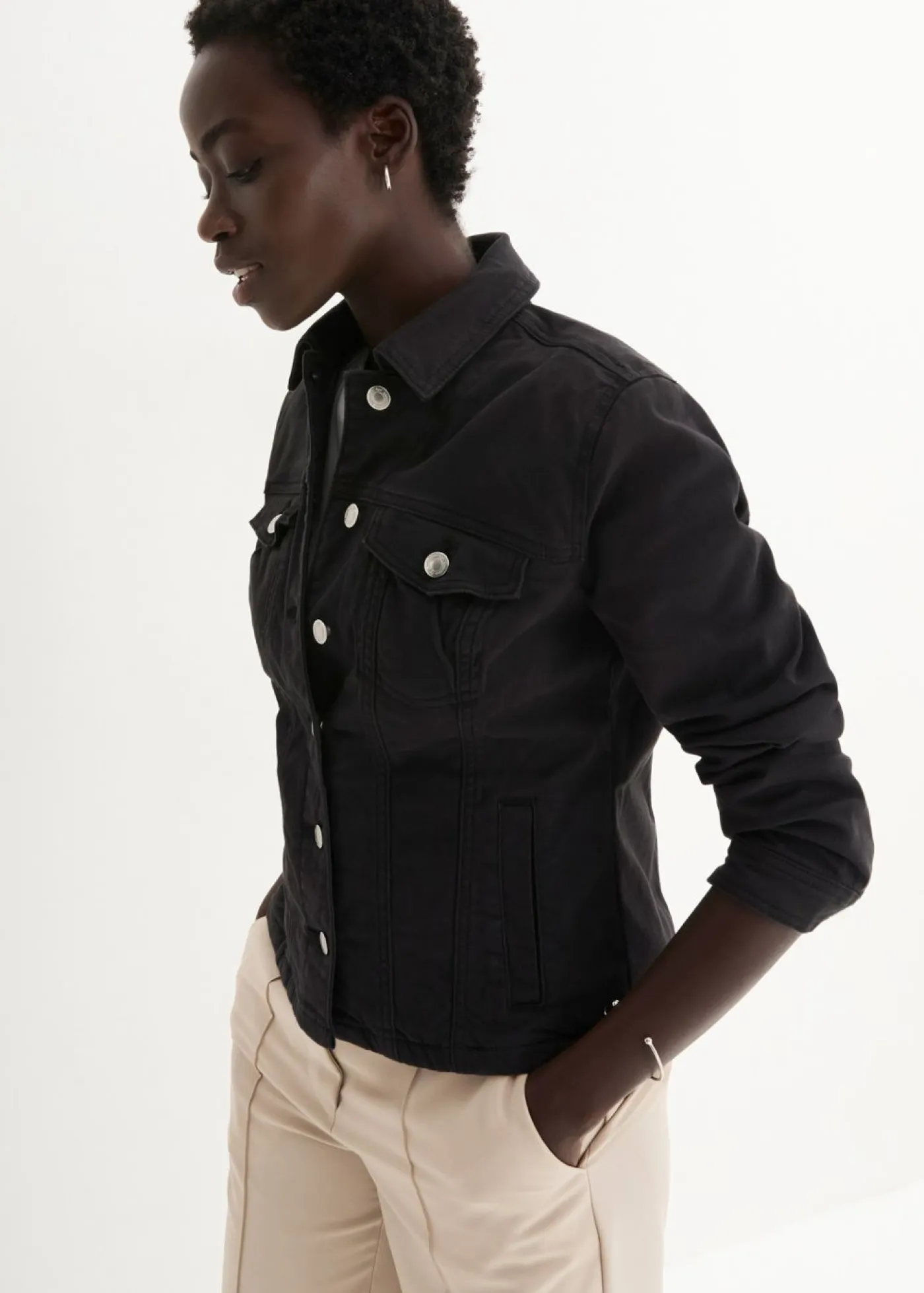Atractiva chaqueta con costura divisoria. Largo de aprox. 60 cm en talla 42. Se puede lavar a máquina.