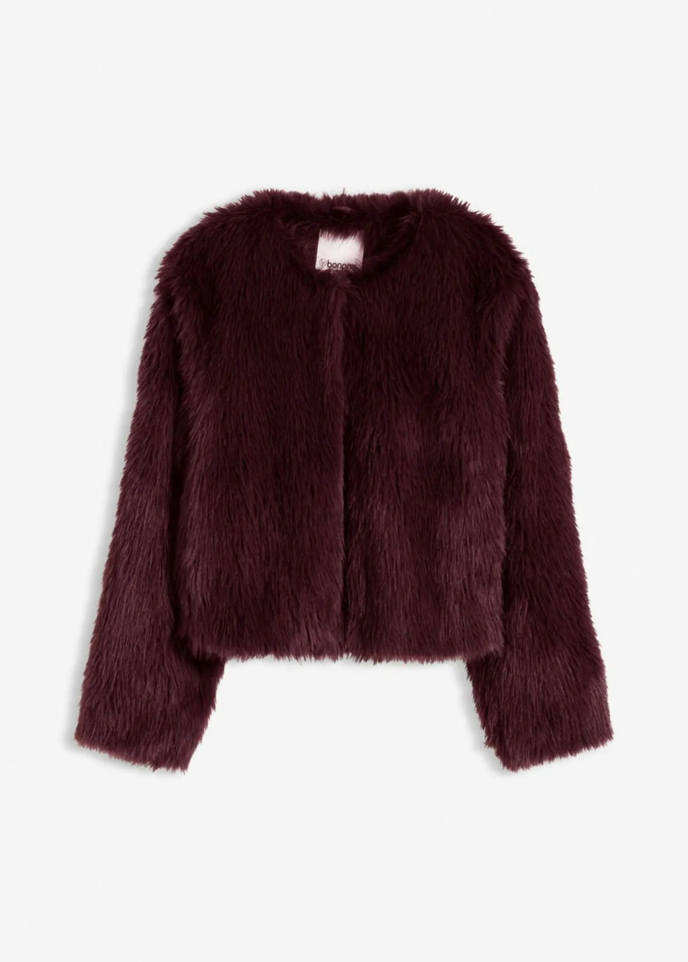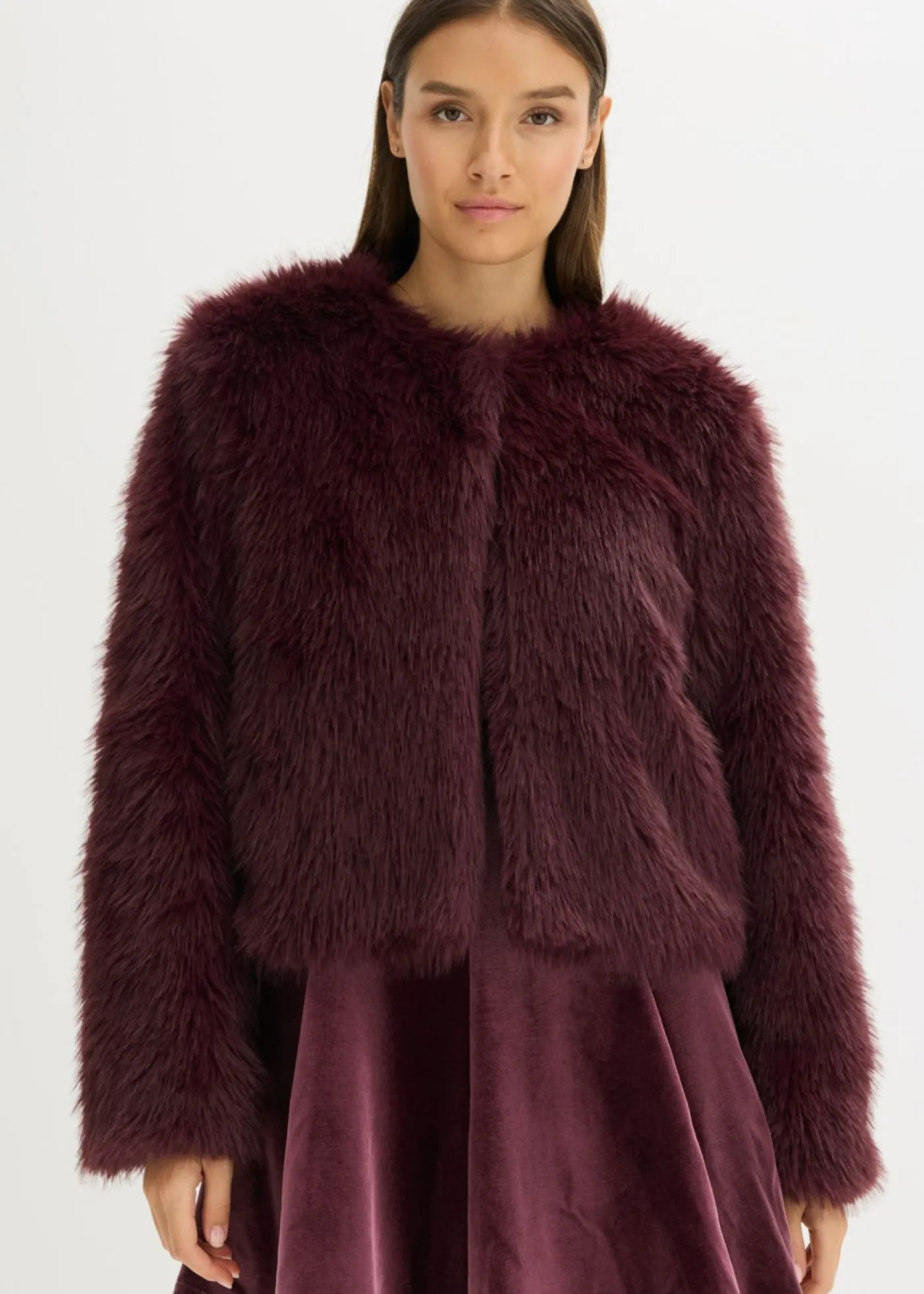 Chaqueta corta de pelo sintético a la moda con cuello redondo y cierre de gancho y ojal en la parte delantera.