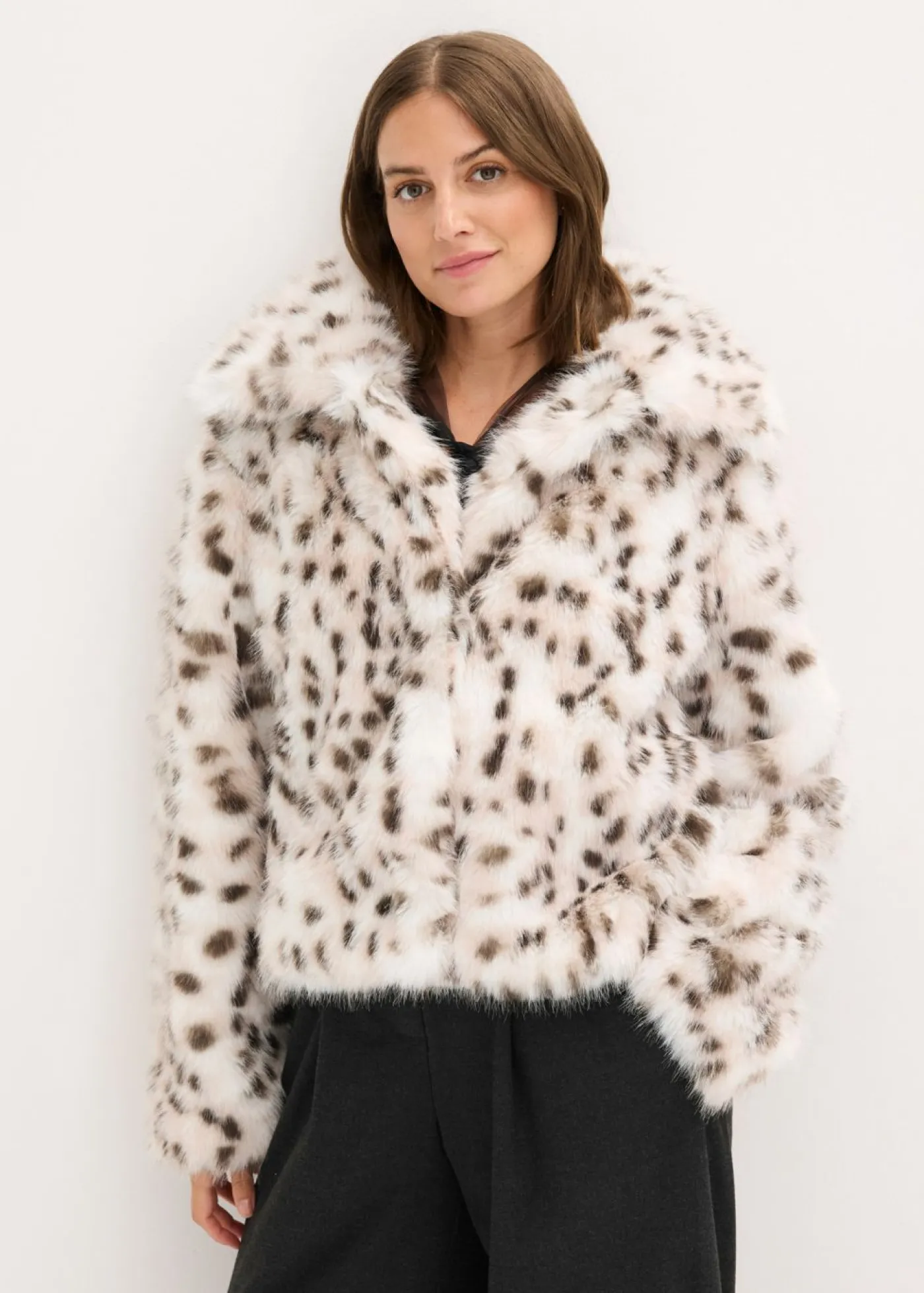Moderna chaqueta de piel sintética con cuello de solapa y cierre de botones a presión en la parte delantera.